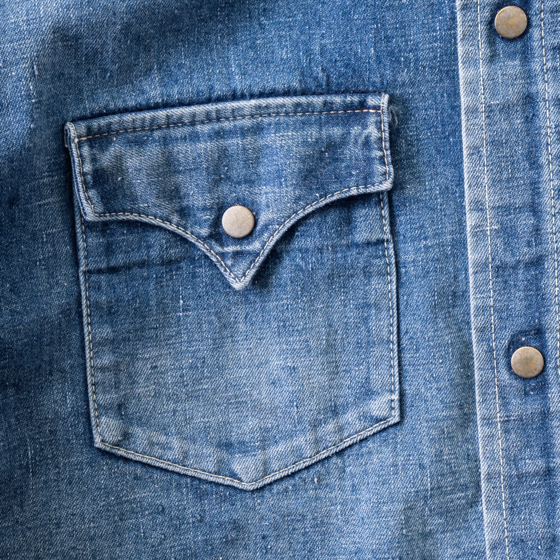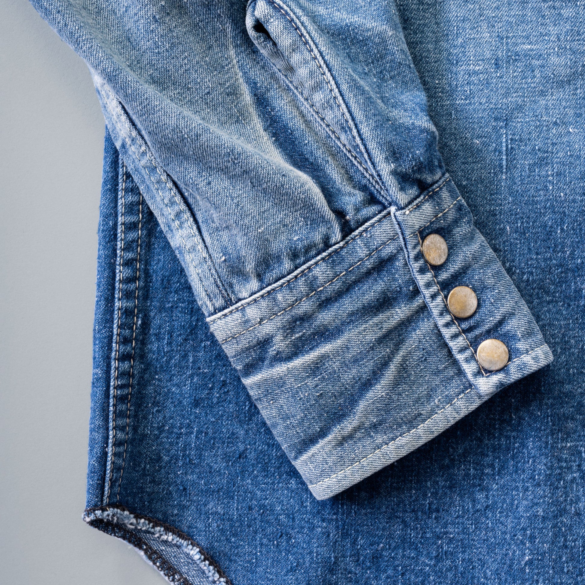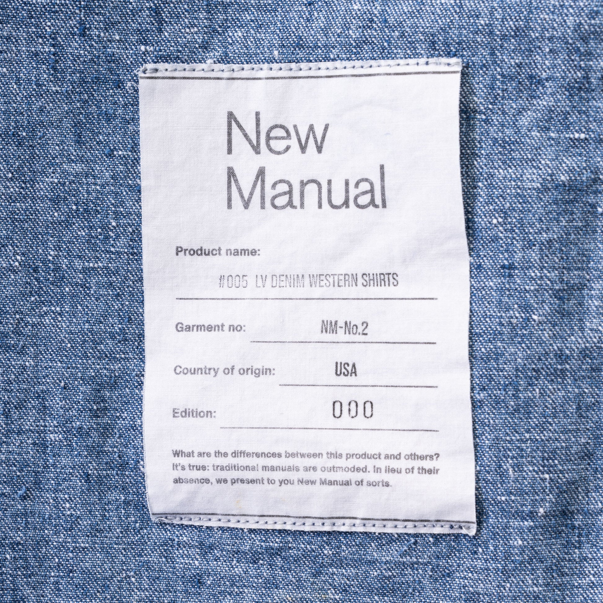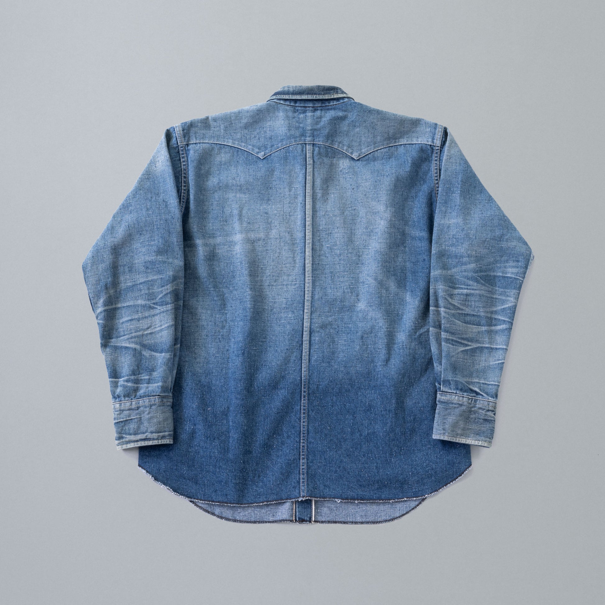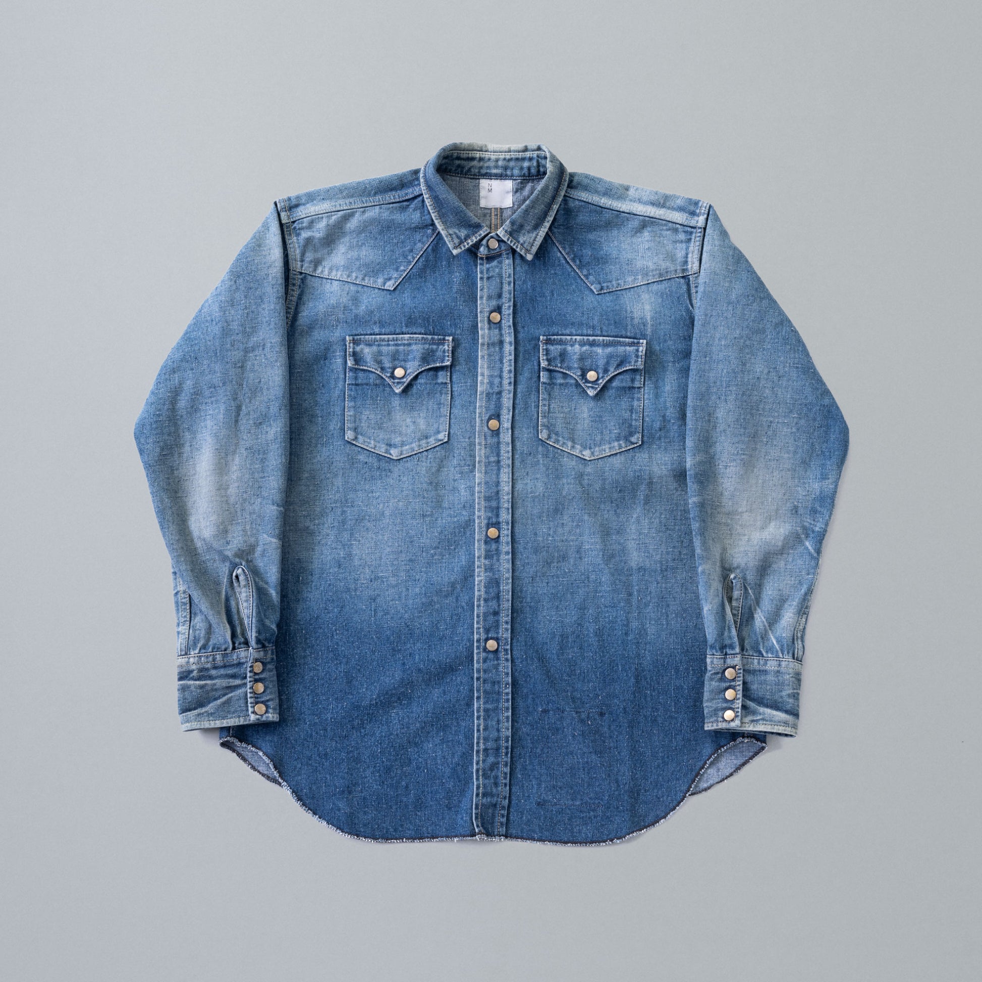 Based on a Western denim shirt from the 1950s, this piece features distinctive flap designs and hem details. Drawing on the big-size original, it incorporates a back seam and updates the cut for modern wear by reducing the pronounced waist taper and adjusting the overall length. The sewing is finished to the highest standard, free from distortion. This is New Manual #005.