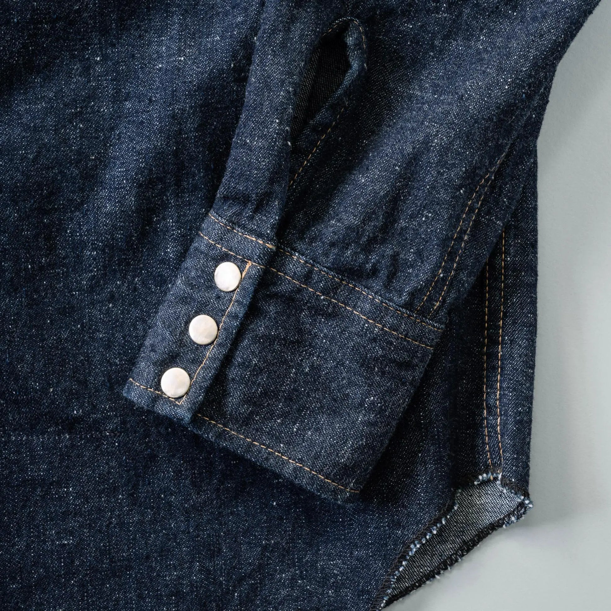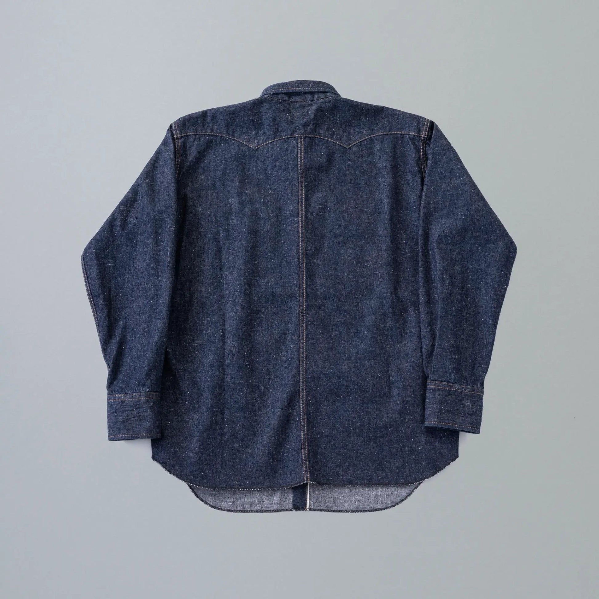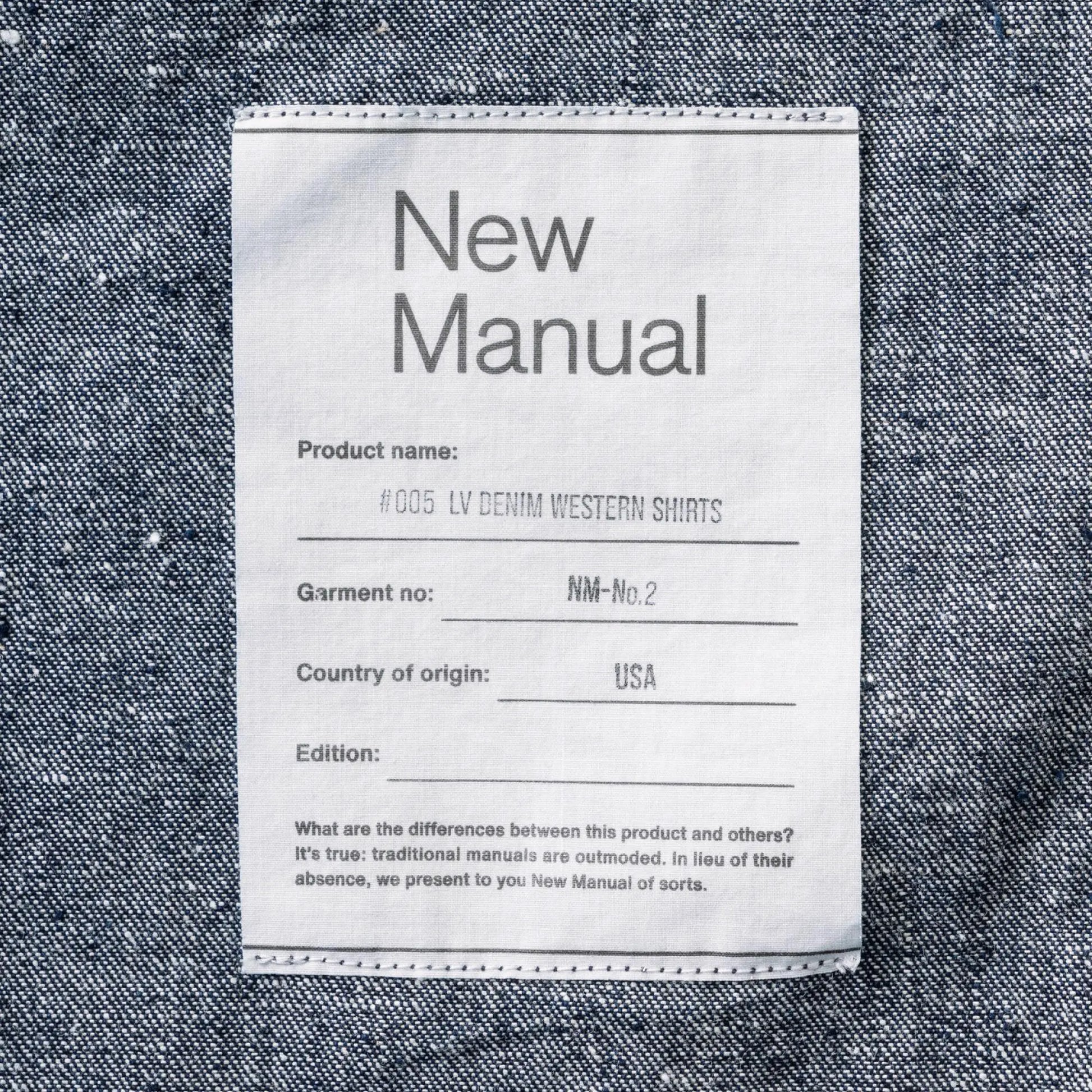 Based on a Western denim shirt from the 1950s, this piece features distinctive flap designs and hem details. Drawing on the big-size original, it incorporates a back seam and updates the cut for modern wear by reducing the pronounced waist taper and adjusting the overall length. The sewing is finished to the highest standard, free from distortion. This is New Manual #005.