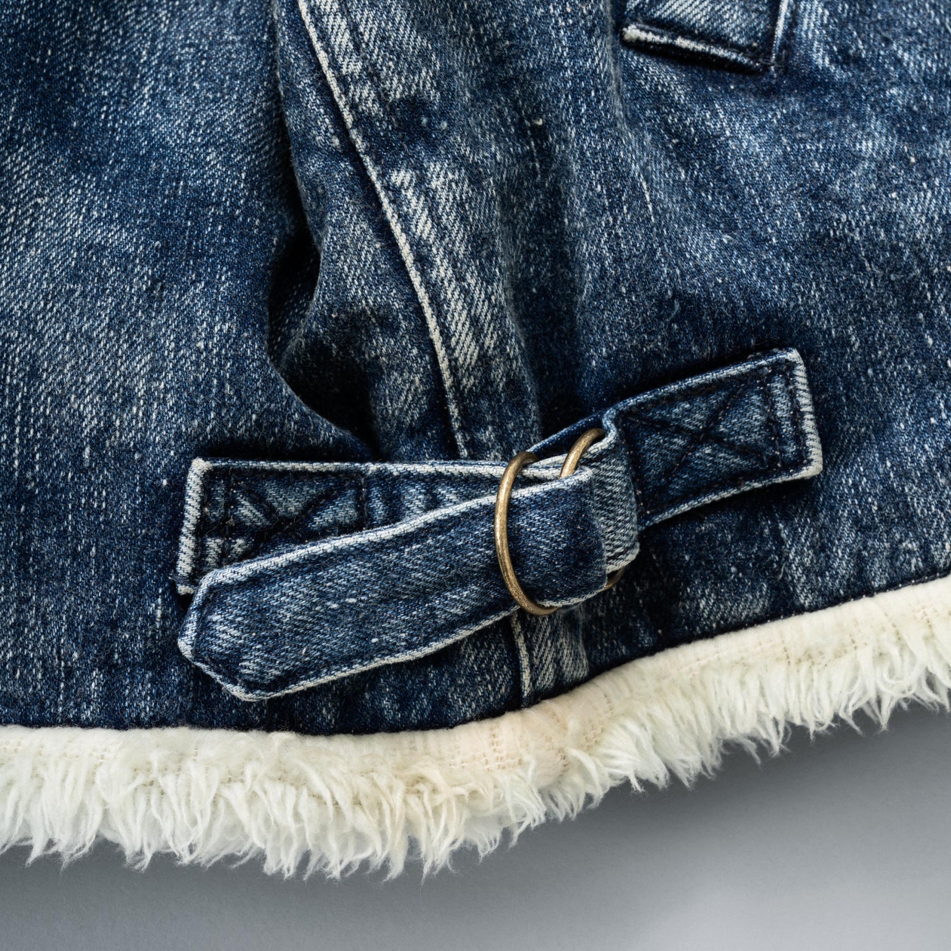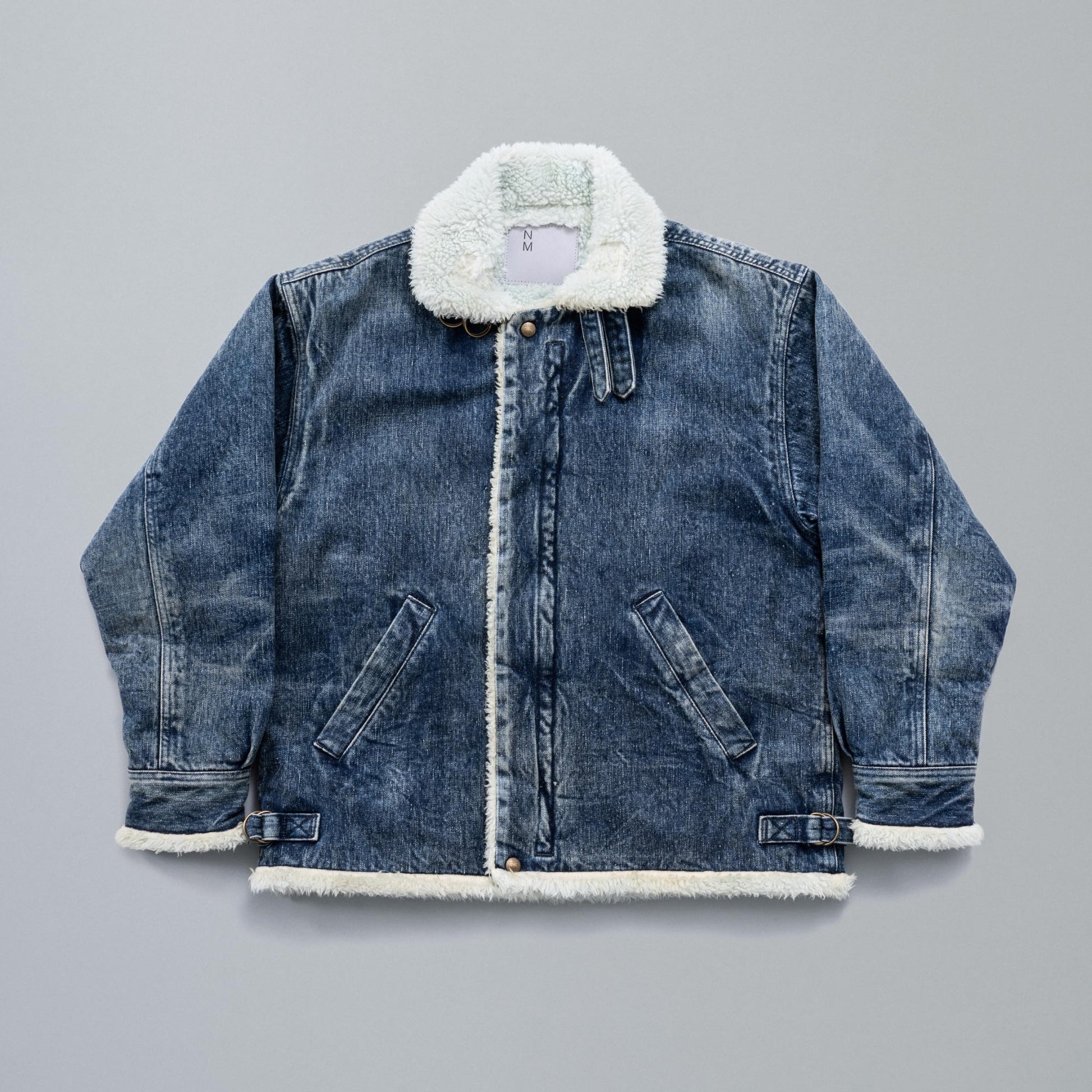 Based on a B‑3–style denim jacket from the 1980s, this piece faithfully reproduces the original boxy silhouette, while refining the collar, which tended to shrink and feel restrictive, for easier wear. With both pile lining and padding, it offers excellent cold‑weather protection. Available in two colors: blue (indigo) and black. The black version features matching black pile, serving as a counterpart to the white pile used on the blue model. Although the original jacket featured a chemical‑wash finish, this model recreates vintage fading, whiskers, and honeycombs by drawing from another denim jacket. Our carefully selected craftspeople have created a finish incorporating details that would normally be overlooked to achieve this distinctive aged look. This is New Manual #008.