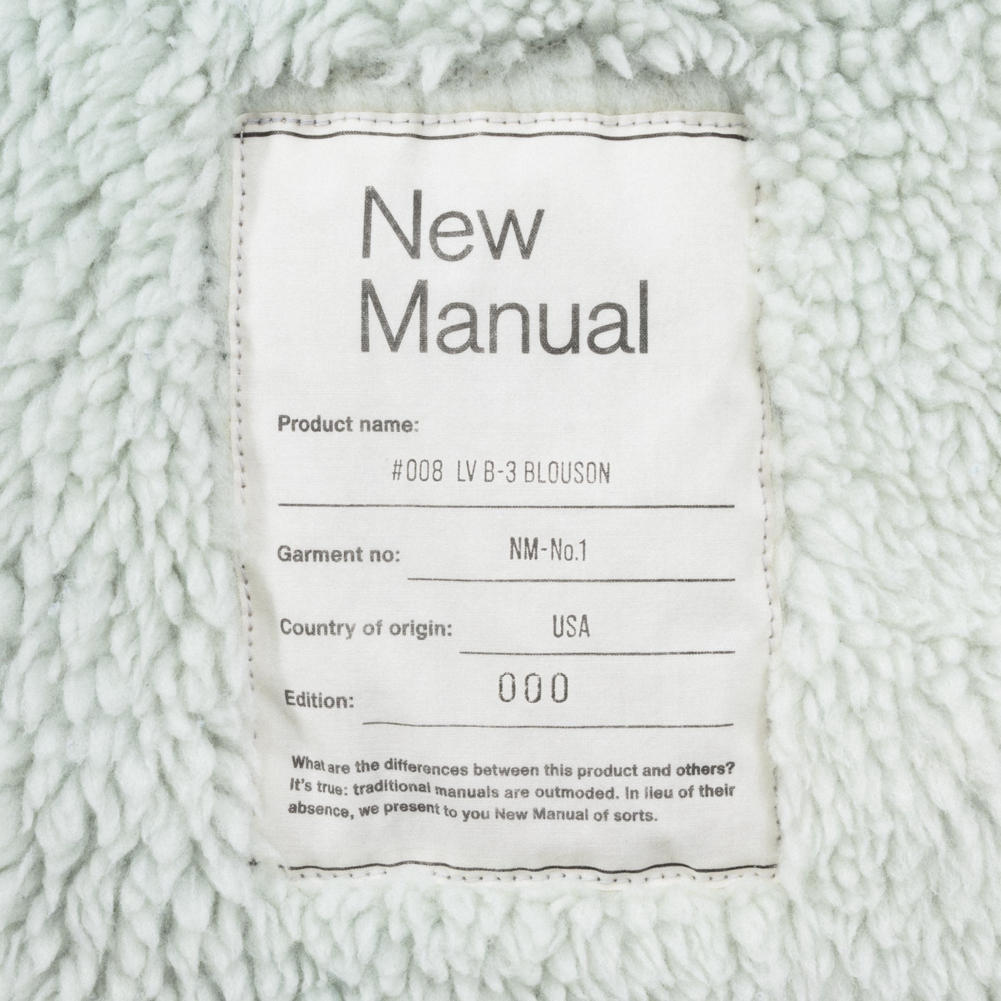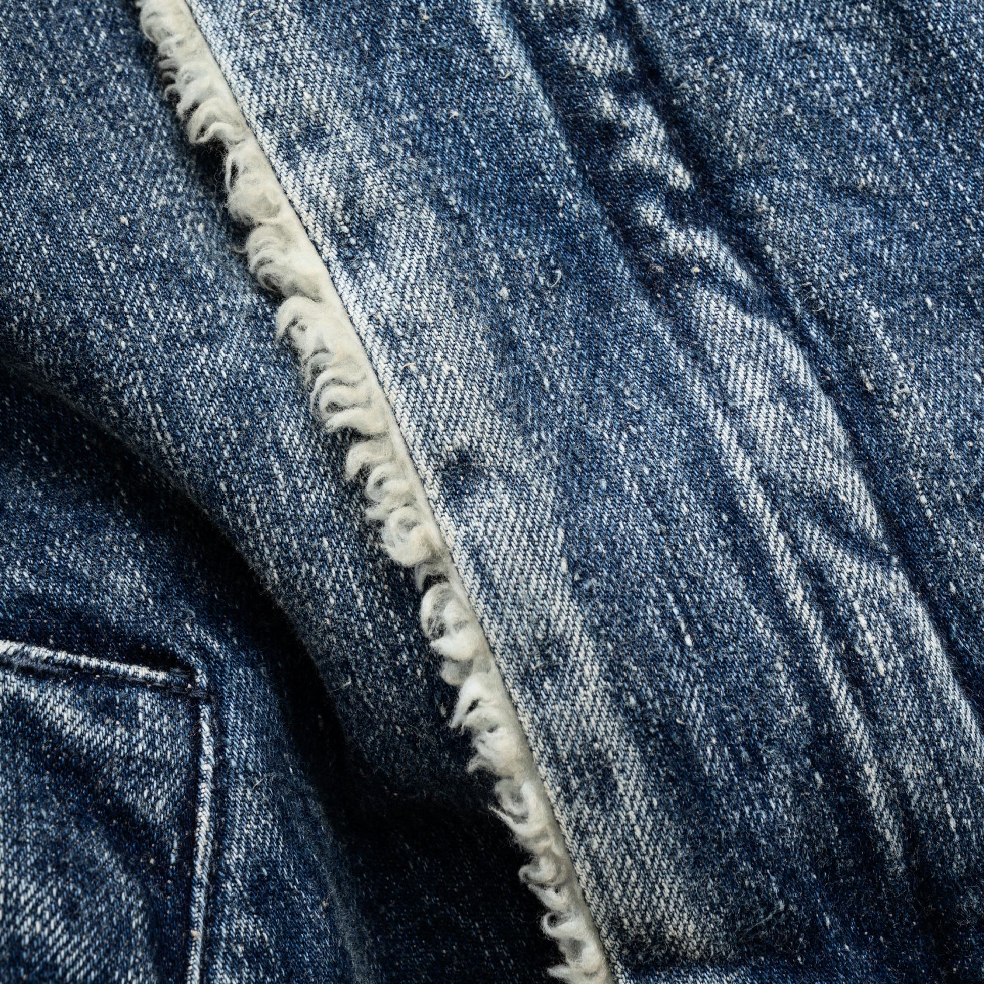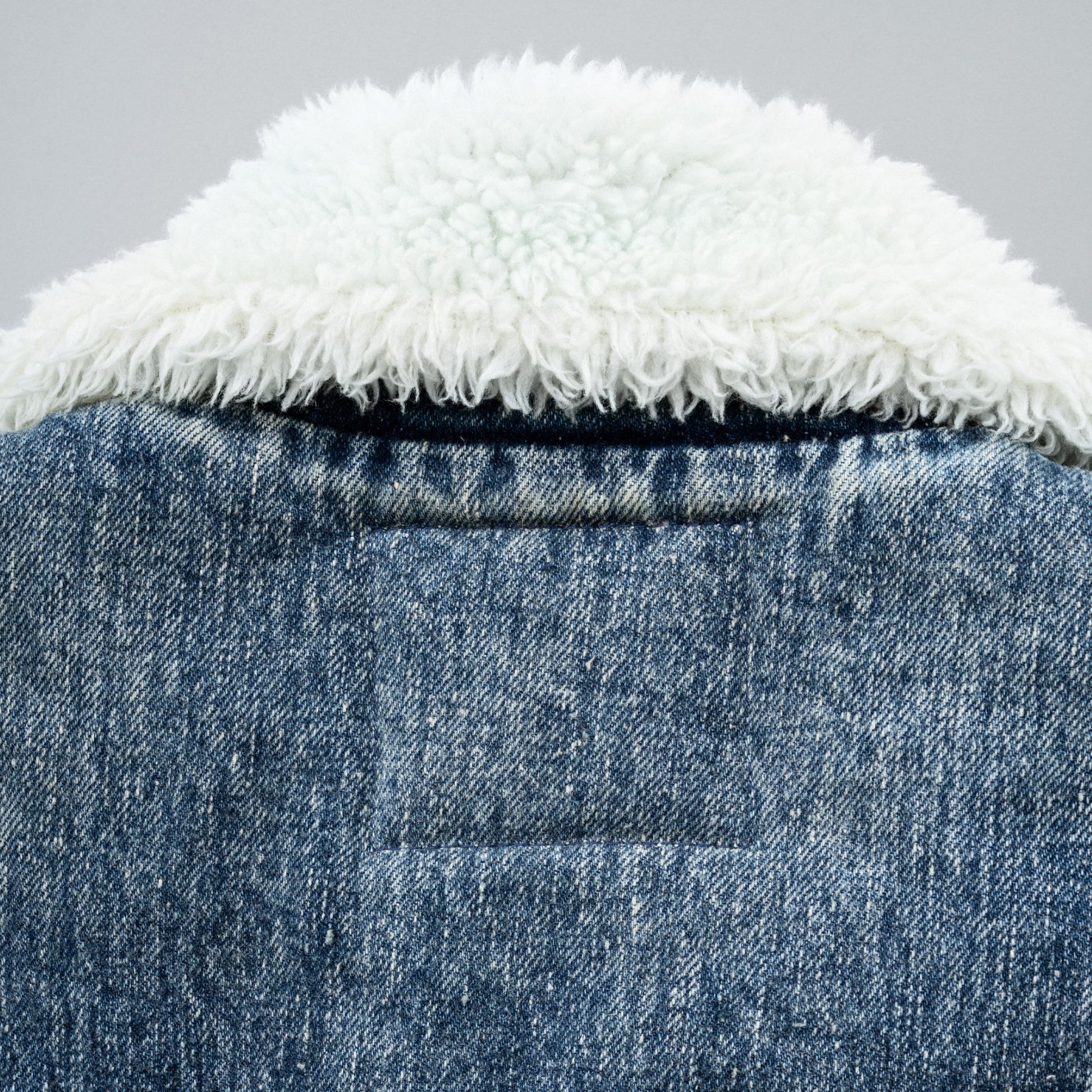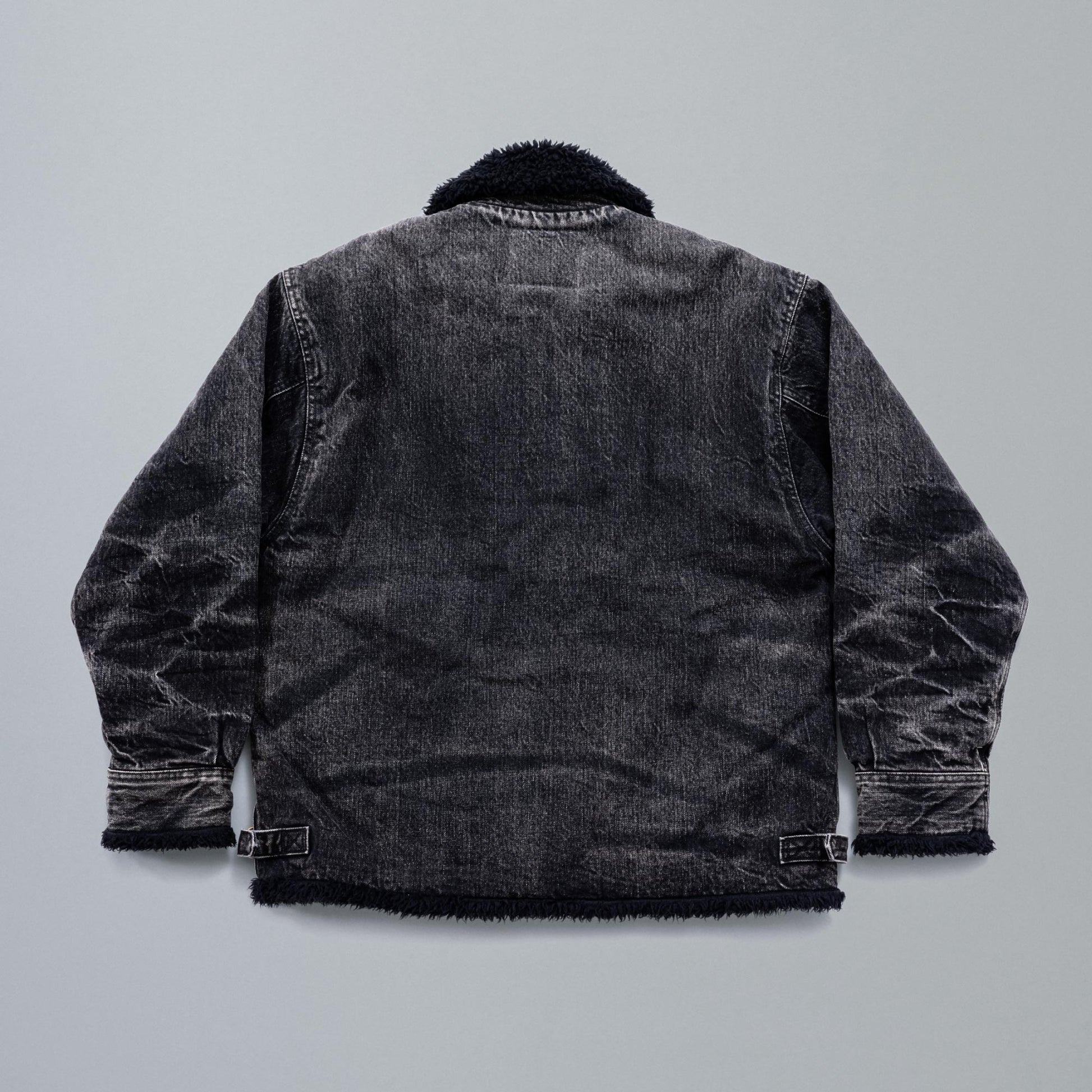 Based on a B‑3–style denim jacket from the 1980s, this piece faithfully reproduces the original boxy silhouette, while refining the collar, which tended to shrink and feel restrictive, for easier wear. With both pile lining and padding, it offers excellent cold‑weather protection. Available in two colors: blue (indigo) and black. The black version features matching black pile, serving as a counterpart to the white pile used on the blue model. Although the original jacket featured a chemical‑wash finish, this model recreates vintage fading, whiskers, and honeycombs by drawing from another denim jacket. Our carefully selected craftspeople have created a finish incorporating details that would normally be overlooked to achieve this distinctive aged look. This is New Manual #008.