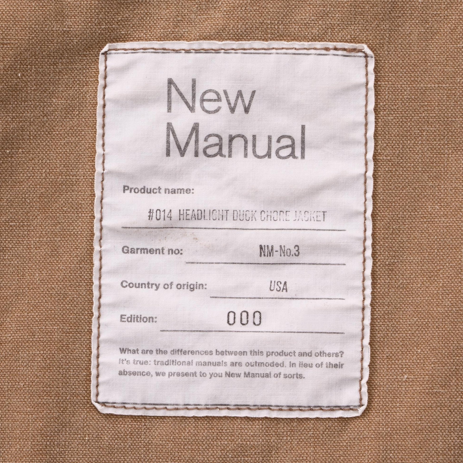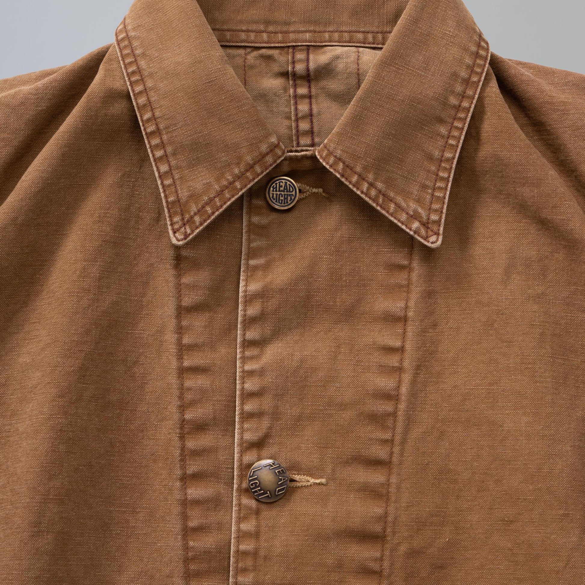 A collaboration with HEADLIGHT based on a mid‑1940s work coat (coverall). Characteristic of wartime models, it features simplified detailing (fewer pockets and buttons) and a graceful A‑line silhouette. Modern updates have been added to the armholes for improved wearability. Instead of the usual white‑and‑red tag, this version features an exceptionally rare yellow (yellow‑and‑blue) tag. The fabric is brown duck dyed with the same sulfur dye as the original, faithfully reproducing vintage fading effects such as whiskering and puckering. Stitching combines wine and brown threads, with bartacks and buttonholes worked in light green. This is New Manual #014.
