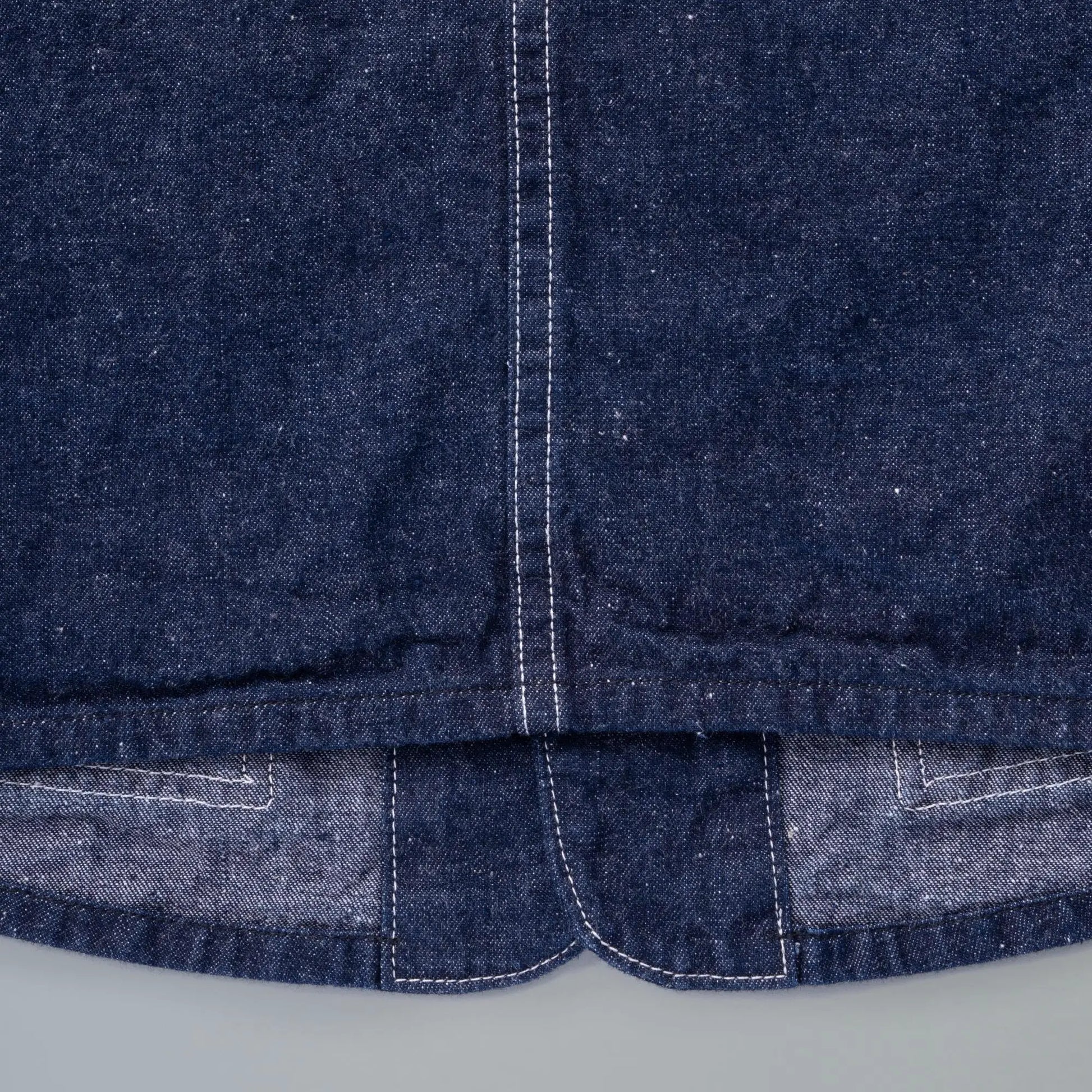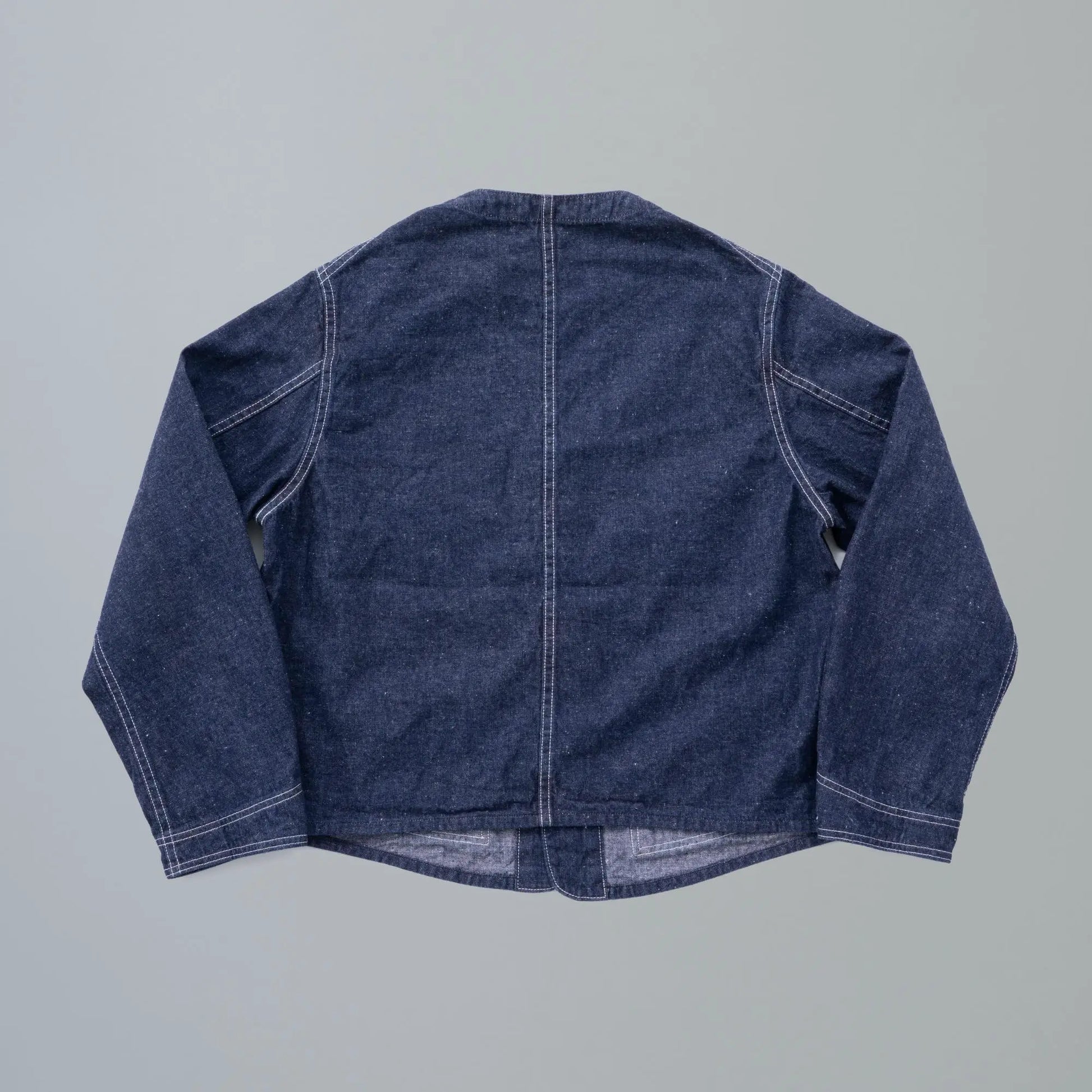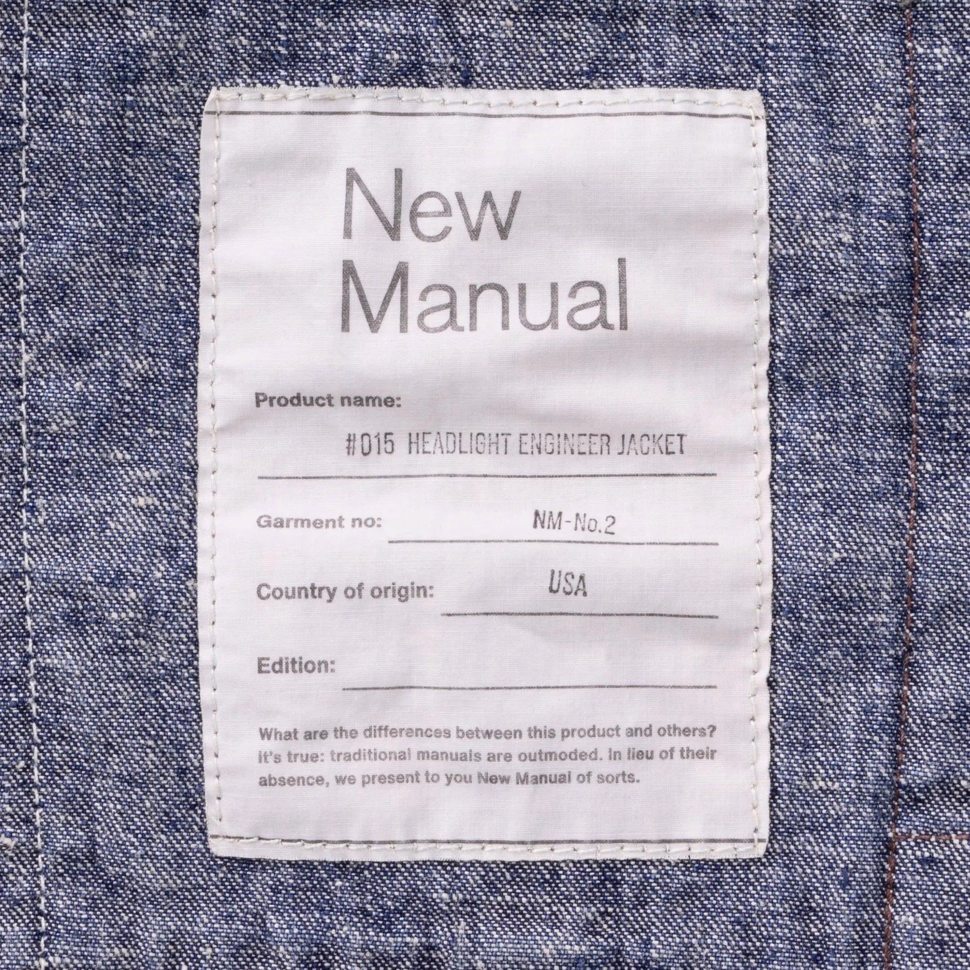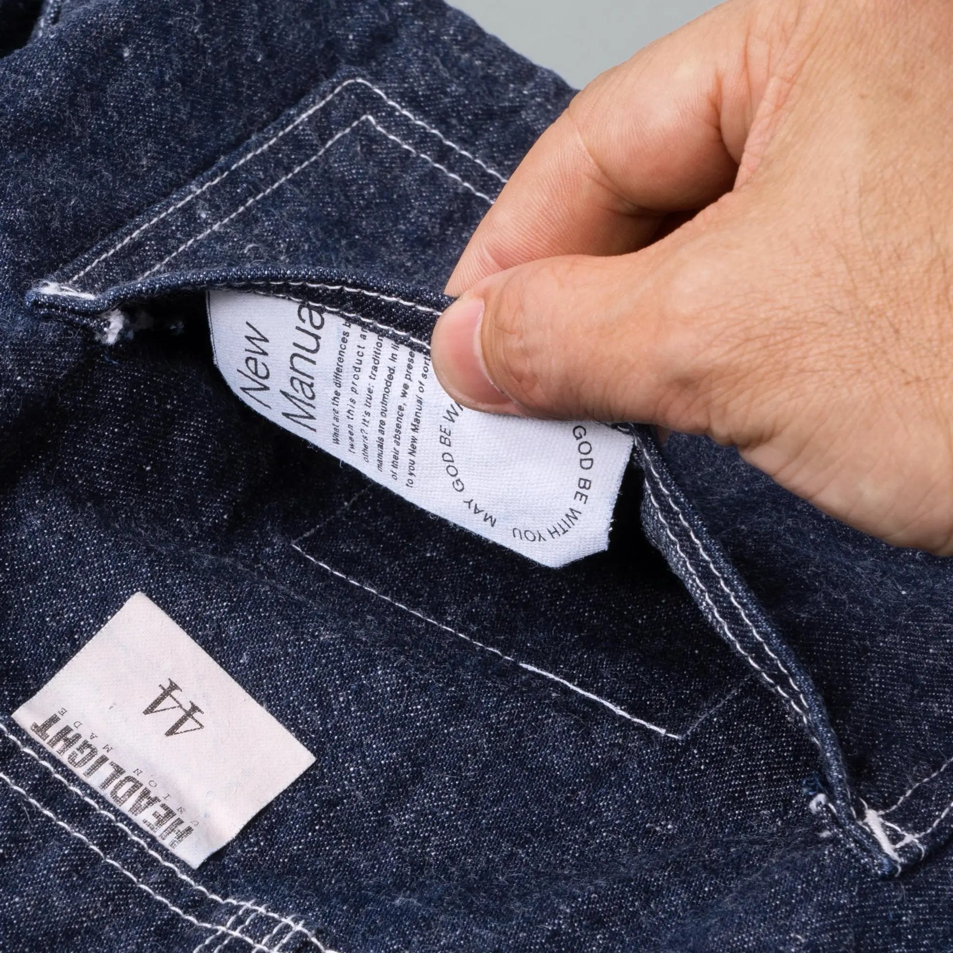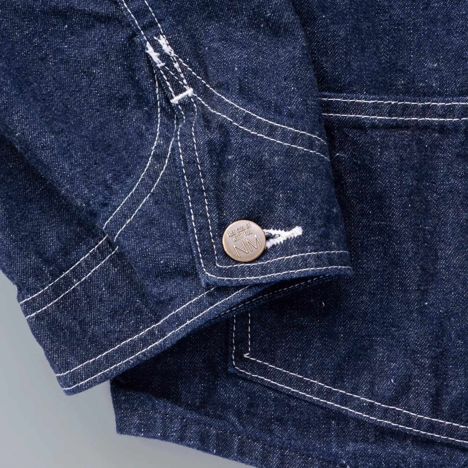 Based on the short jacket affectionately known as the “engineer jacket,” this piece uses brass buttons with navy logos, while preserving wartime details such as button count and unlined pocket construction. The original had an extremely short length, so this version has been lengthened for easier wear, with the armholes lowered for improved comfort. Crafted in NM’s original lightweight denim, it features an exceptionally rare yellow (yellow‑and‑blue) tag in place of the usual white‑and‑red one. This is New Manual #015.