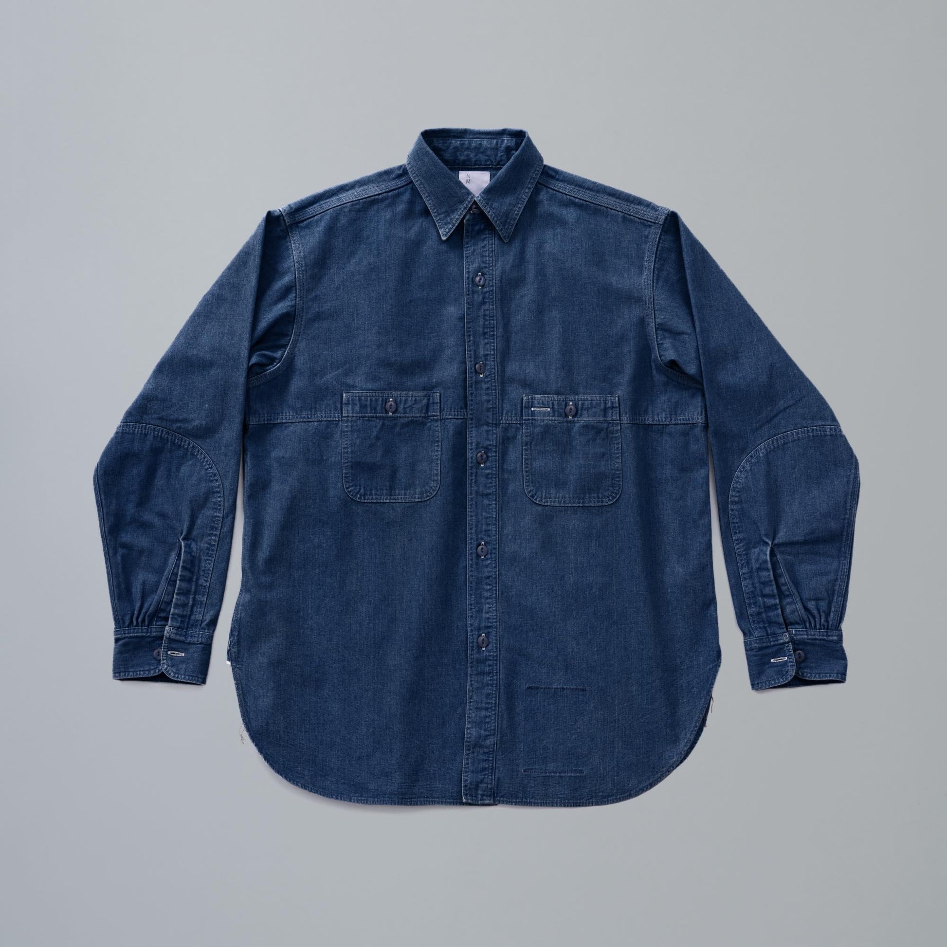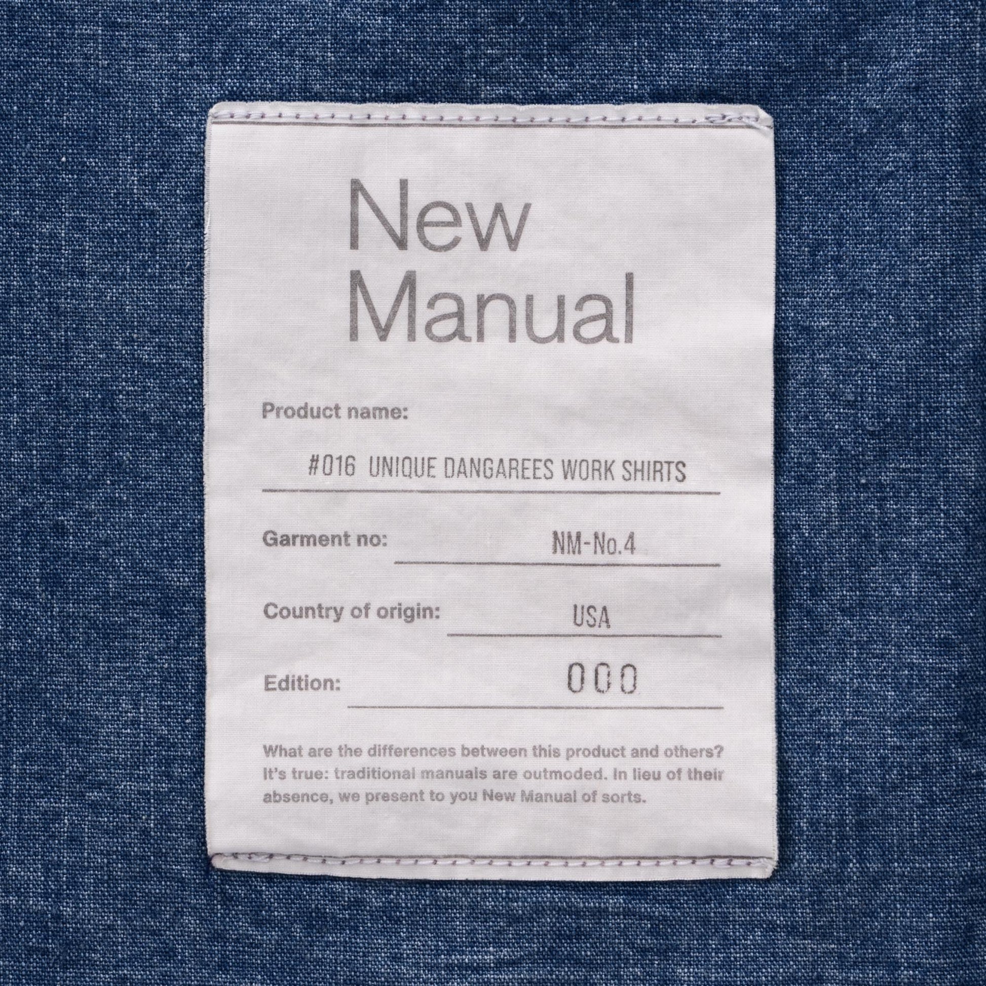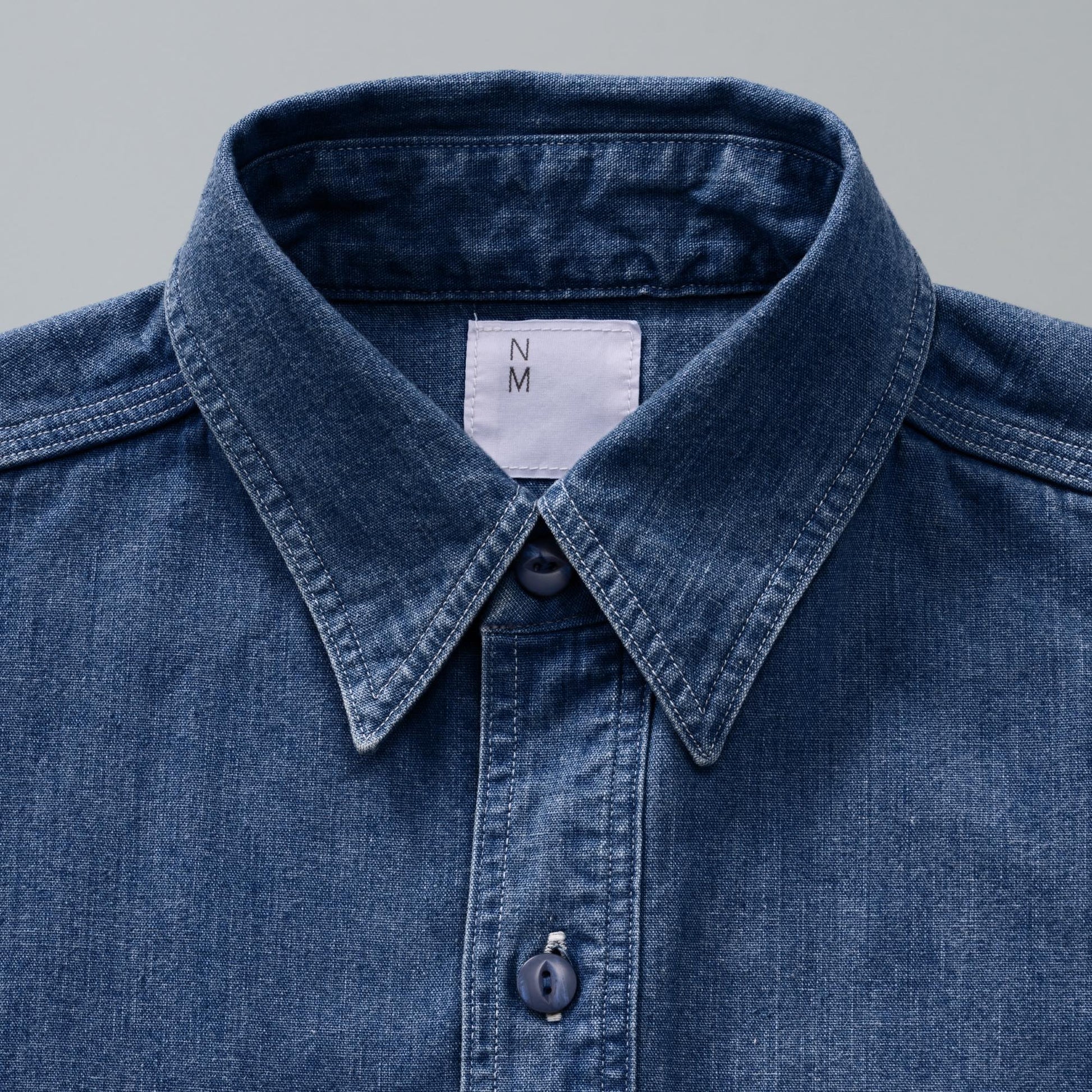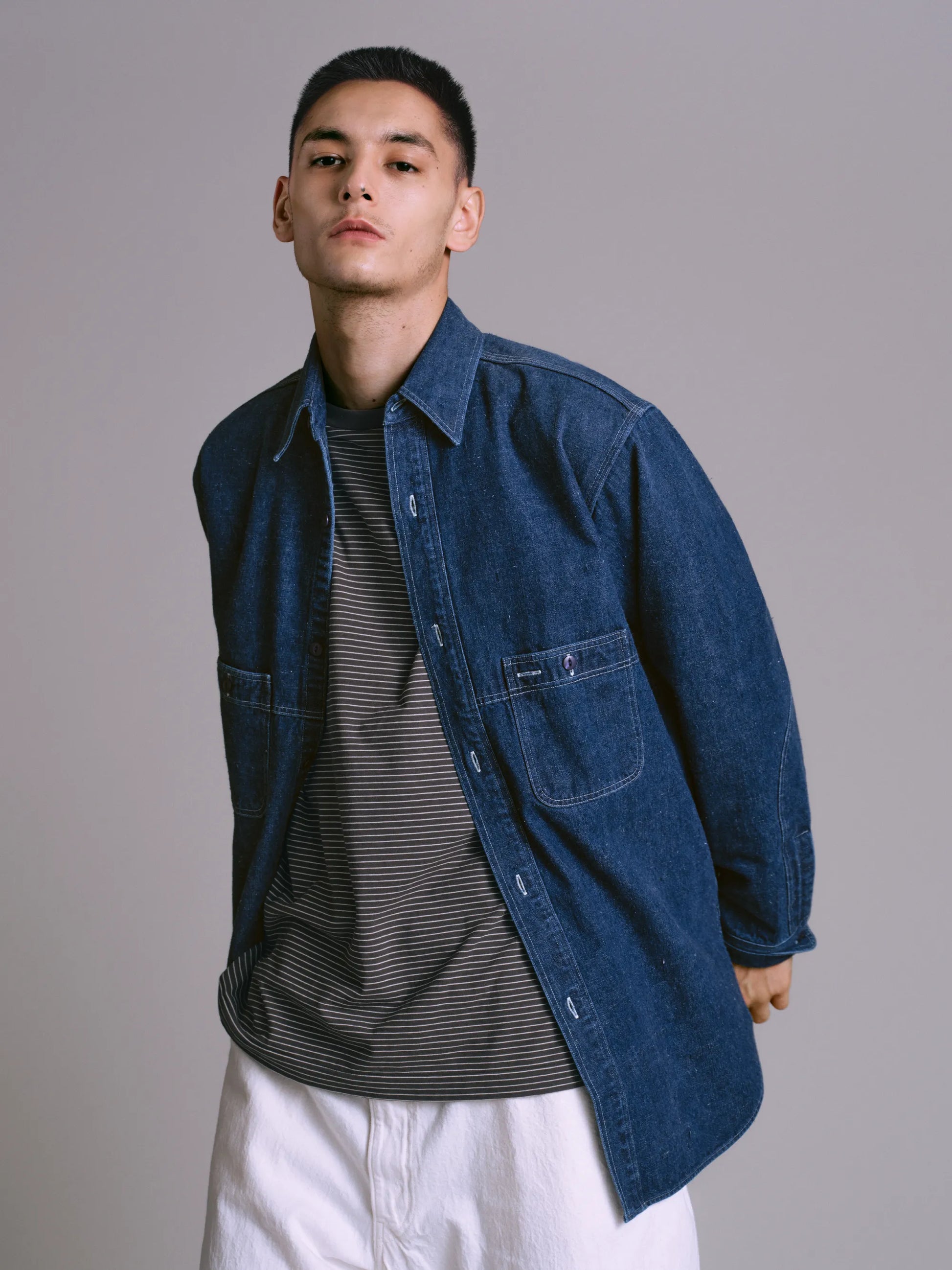 Based on a 1930s work shirt, this piece features a rare construction with a panel seam across the chest and a reinforced double‑layered upper body. The pocket placement and distinctive stitch work also set it apart. While many vintage shirts of the era tend to have very long lengths, the original piece had an exceptionally well‑balanced length that is neither too long nor too short, creating a beautifully proportioned silhouette. Crafted in NM’s original lightweight denim, it is finished in a tone that evokes the look of indigo just beginning to fade and oxidize from sun exposure. This is New Manual #016.