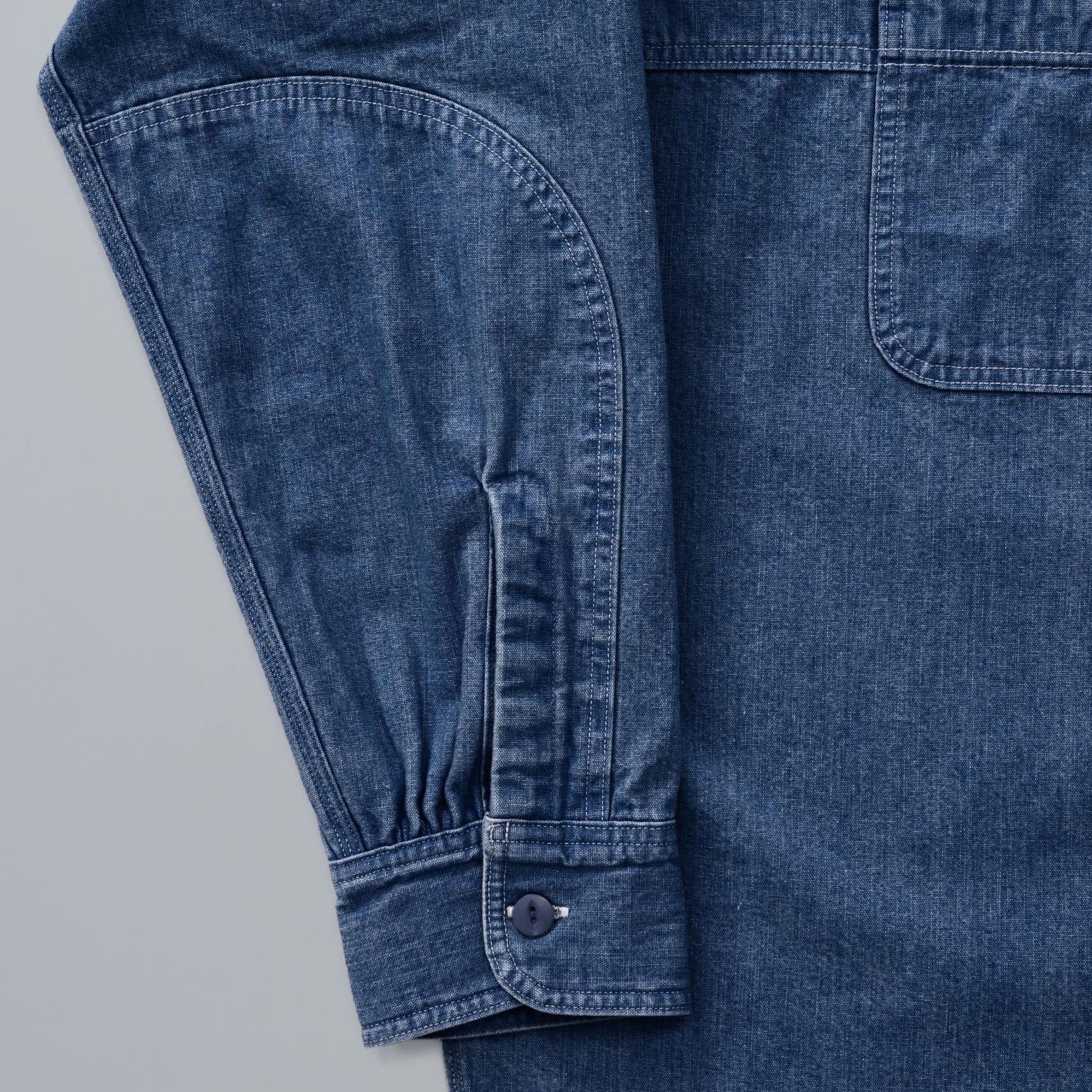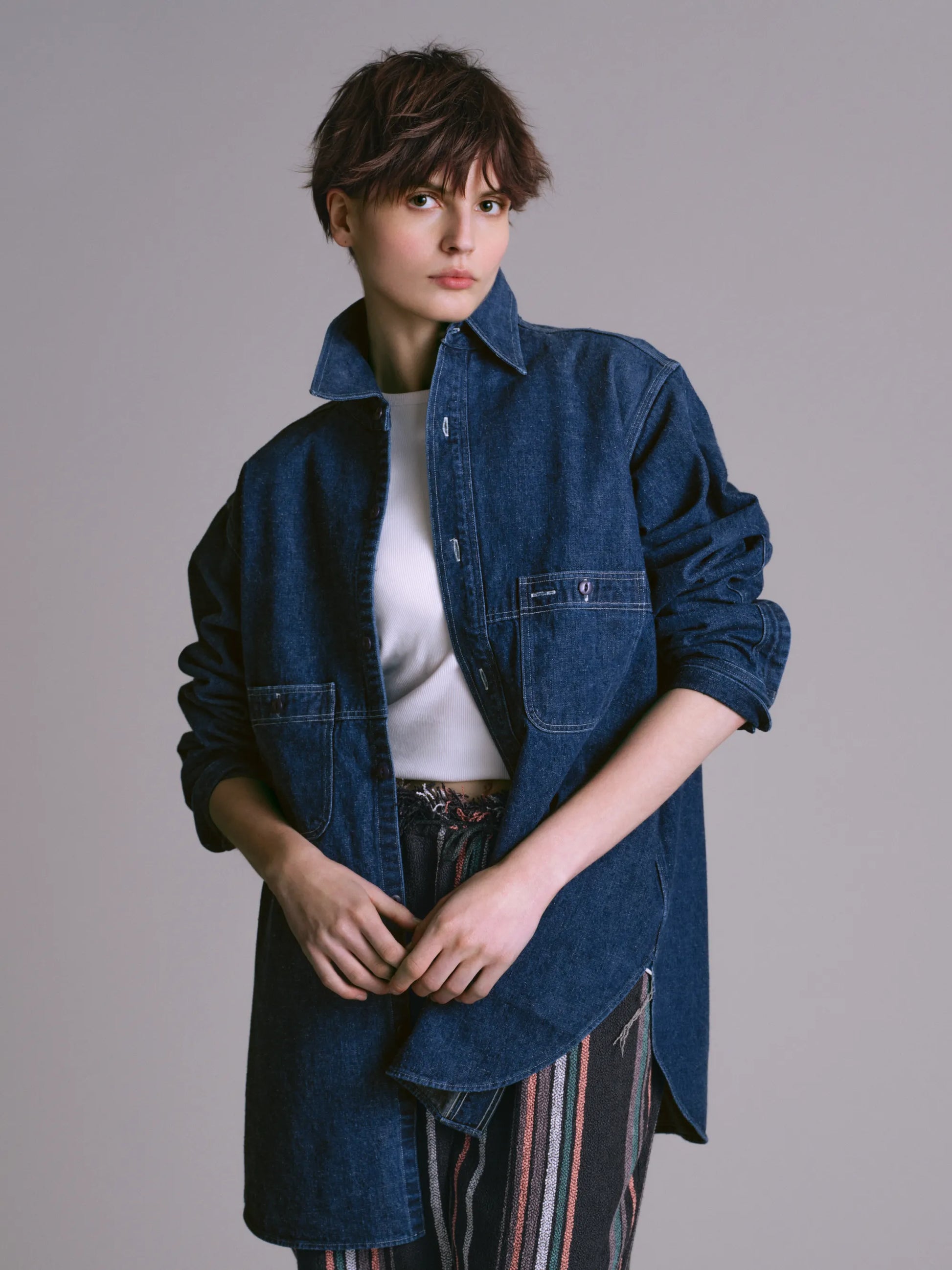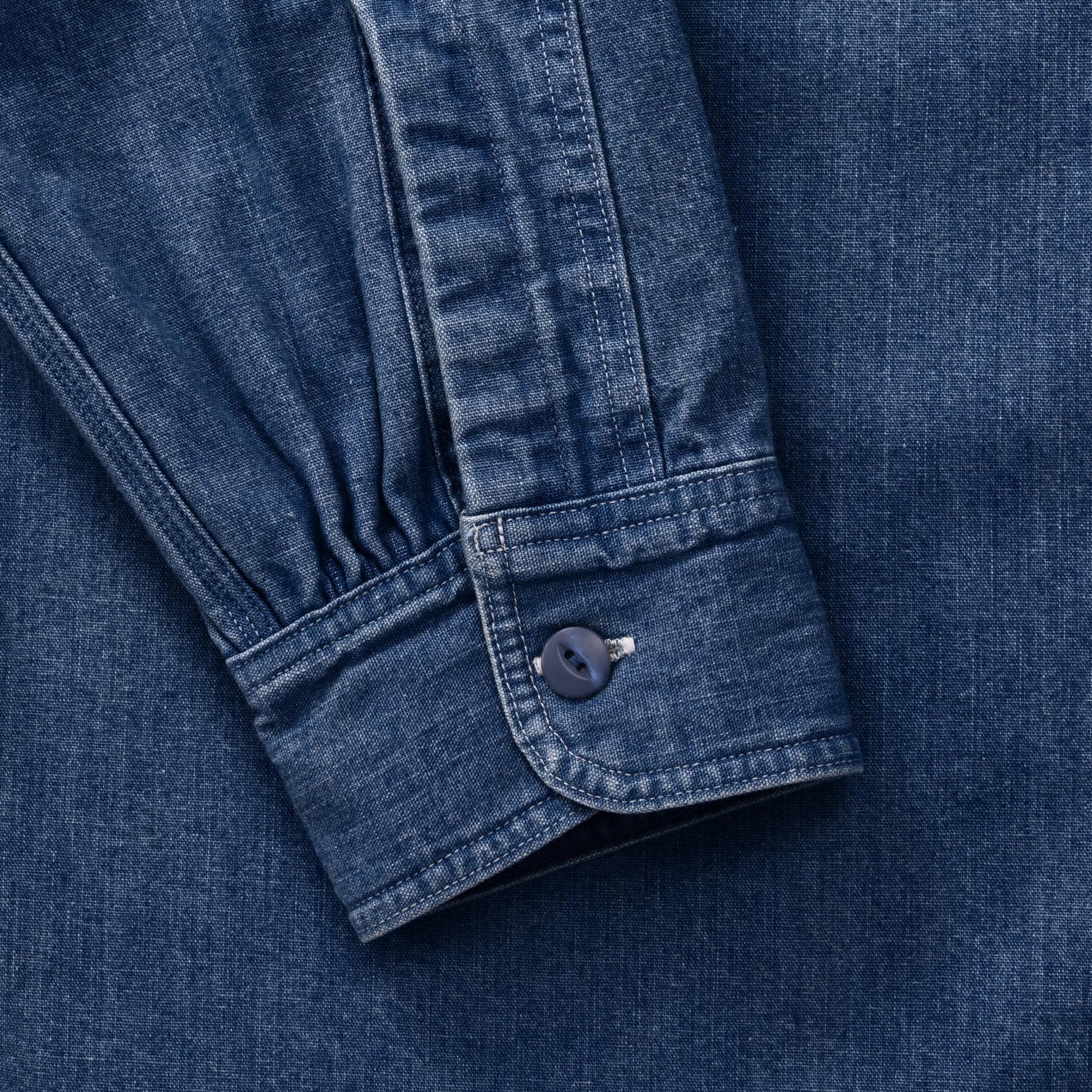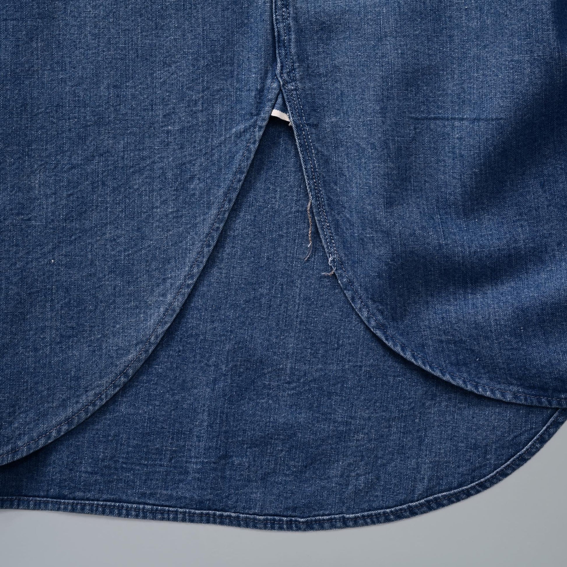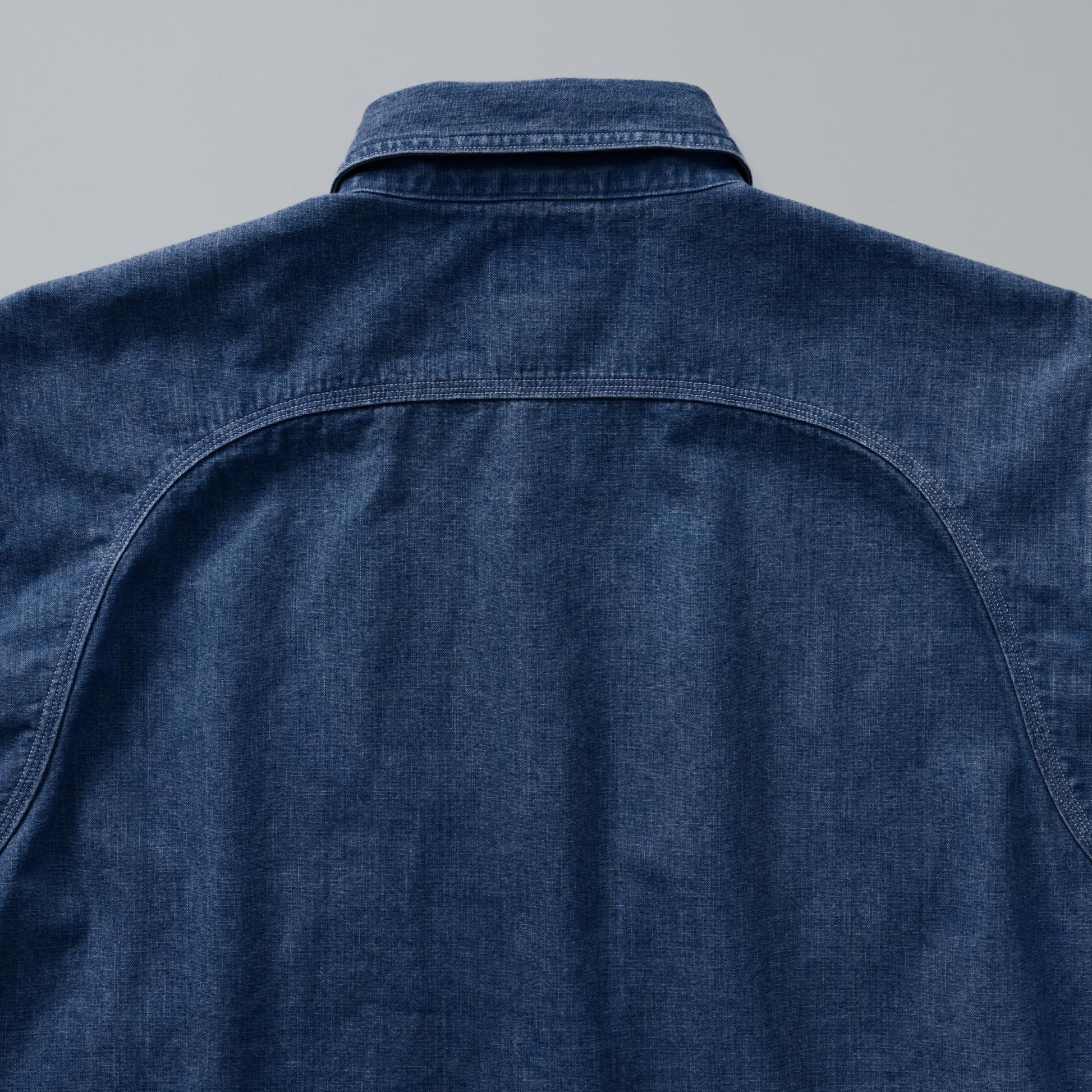 Based on a 1930s work shirt, this piece features a rare construction with a panel seam across the chest and a reinforced double‑layered upper body. The pocket placement and distinctive stitch work also set it apart. While many vintage shirts of the era tend to have very long lengths, the original piece had an exceptionally well‑balanced length that is neither too long nor too short, creating a beautifully proportioned silhouette. Crafted in NM’s original lightweight denim, it is finished in a tone that evokes the look of indigo just beginning to fade and oxidize from sun exposure. This is New Manual #016.