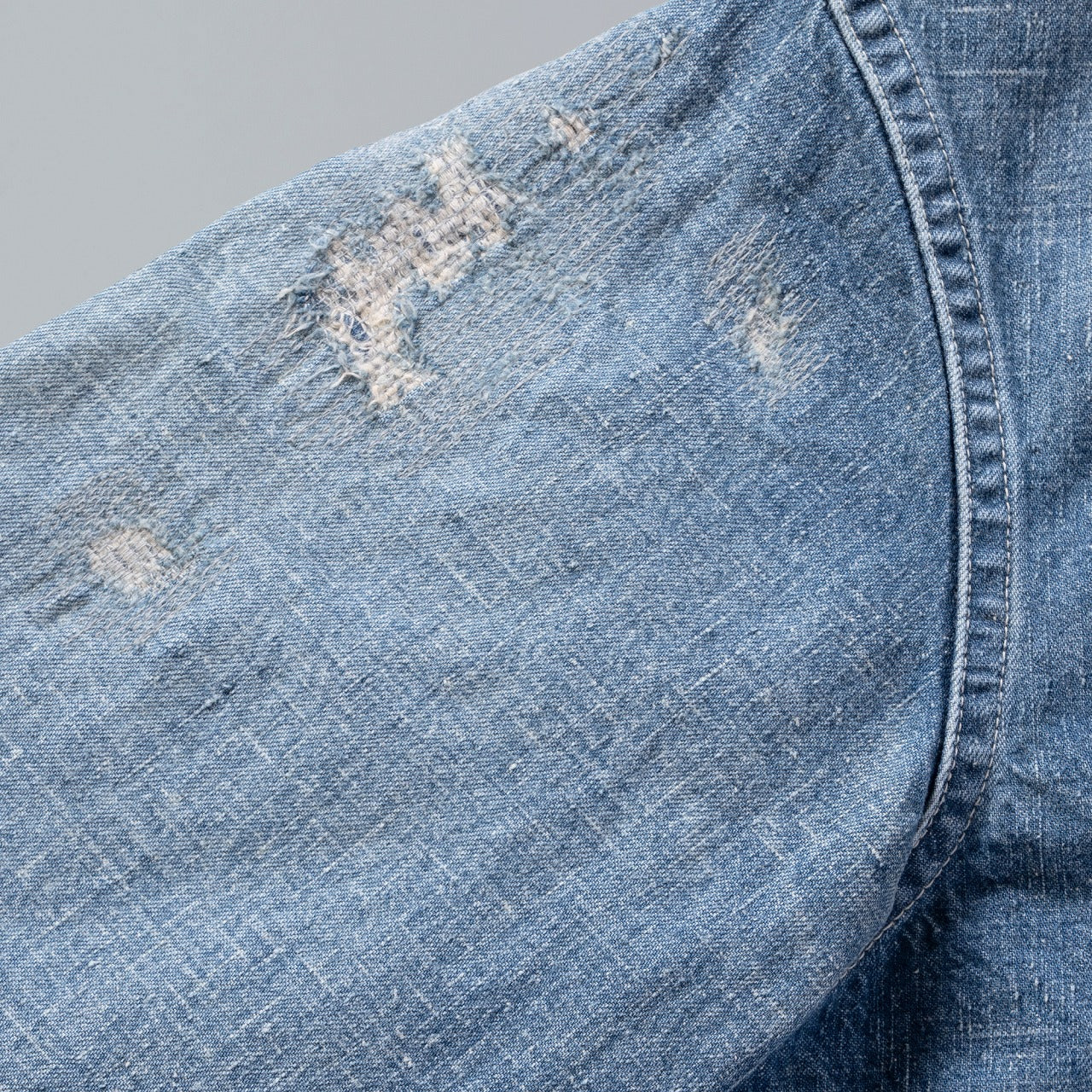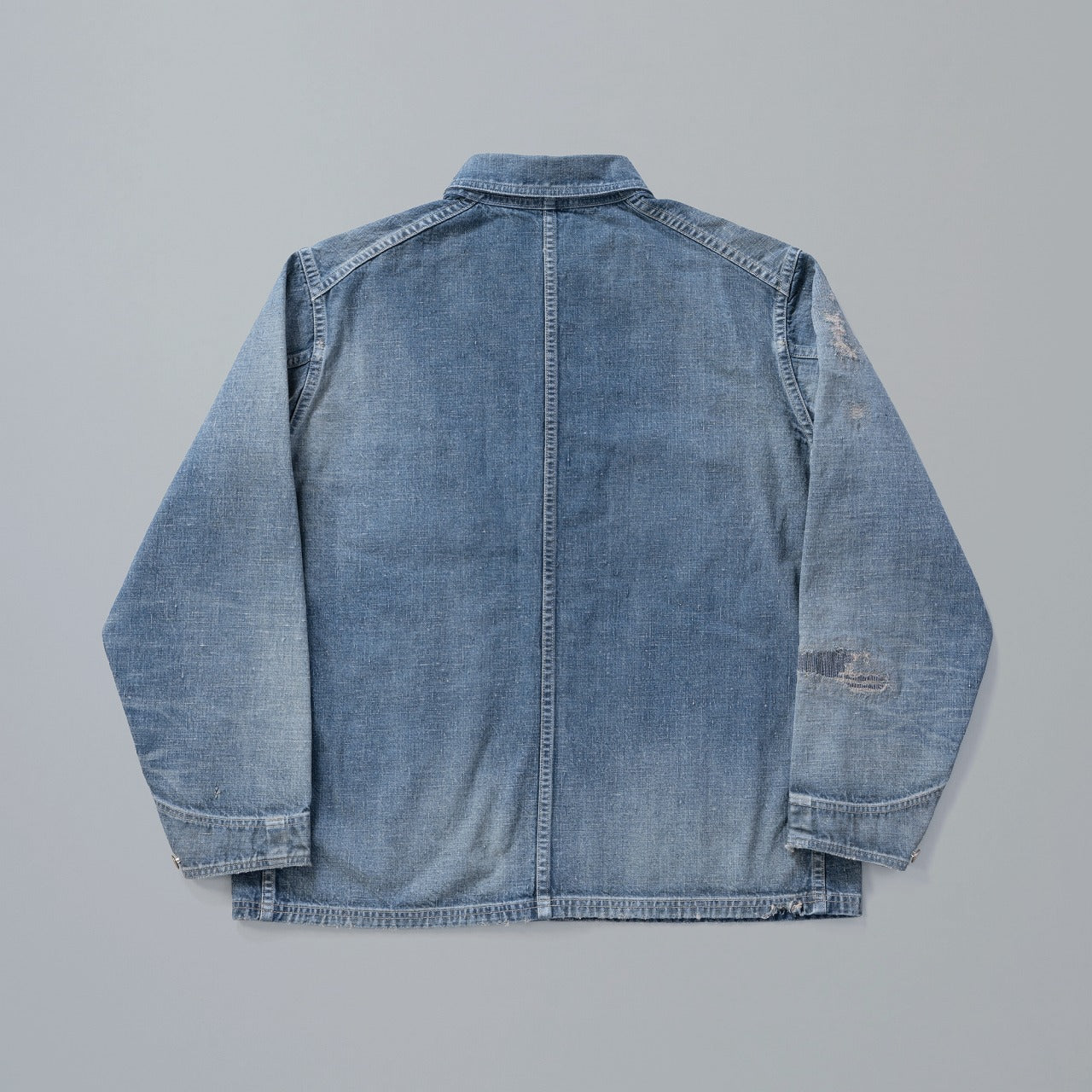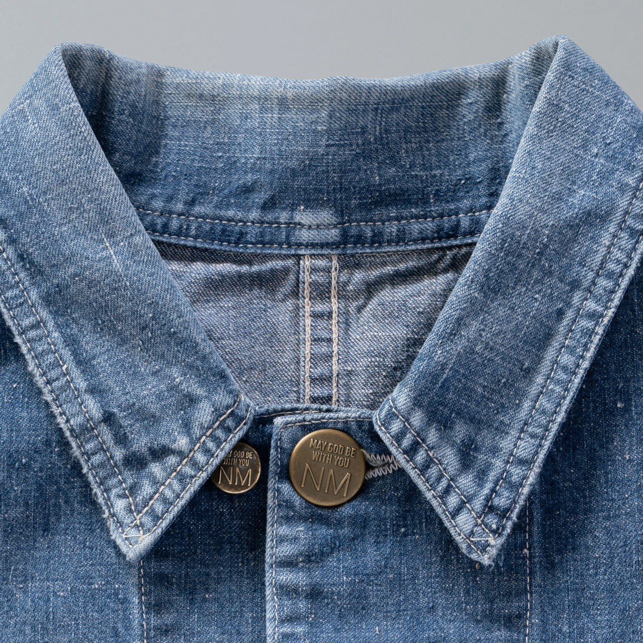 Based on the rare “31 chore jacket” , a rare model even among workwear brands."31" refers to the lower-grade denim material of that era. The originally awkward silhouette has been updated with adjustments to the sleeve cap and armholes for a more modern fit. What sets this piece apart is the outstanding vintage processing, such as the nuanced fading and aged detailing, all reproduced through specialized techniques rarely performed by even the most skilled craftsmen. Like the original piece, the pocket has been intentionally removed. The fabric is also a specially developed original.