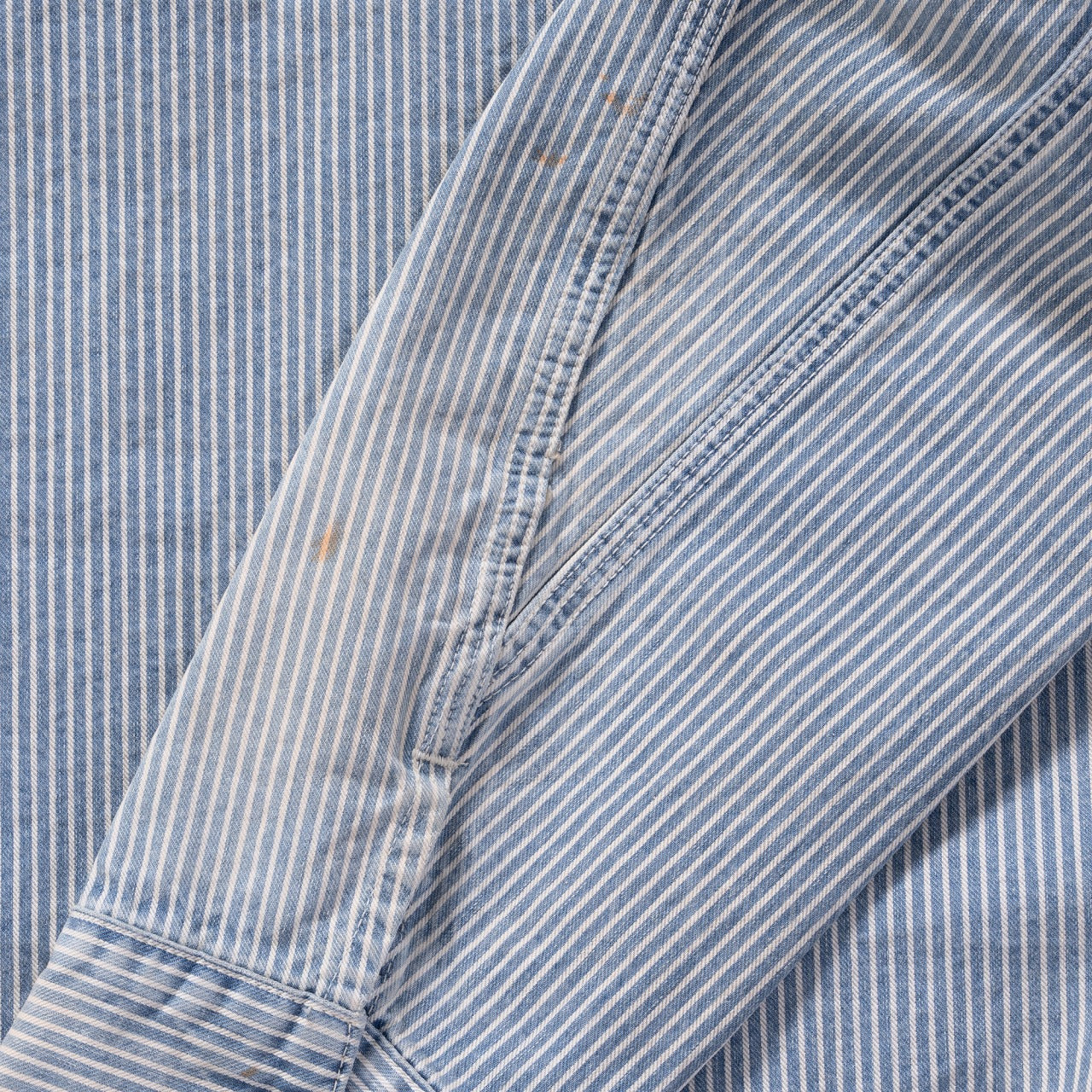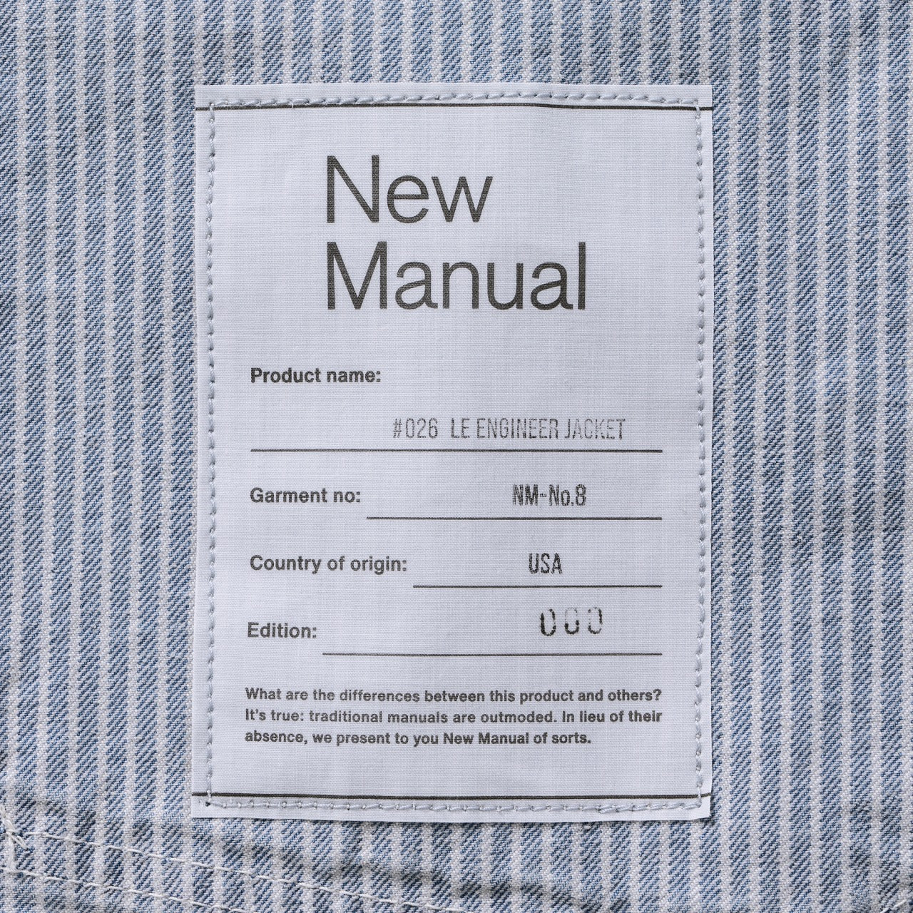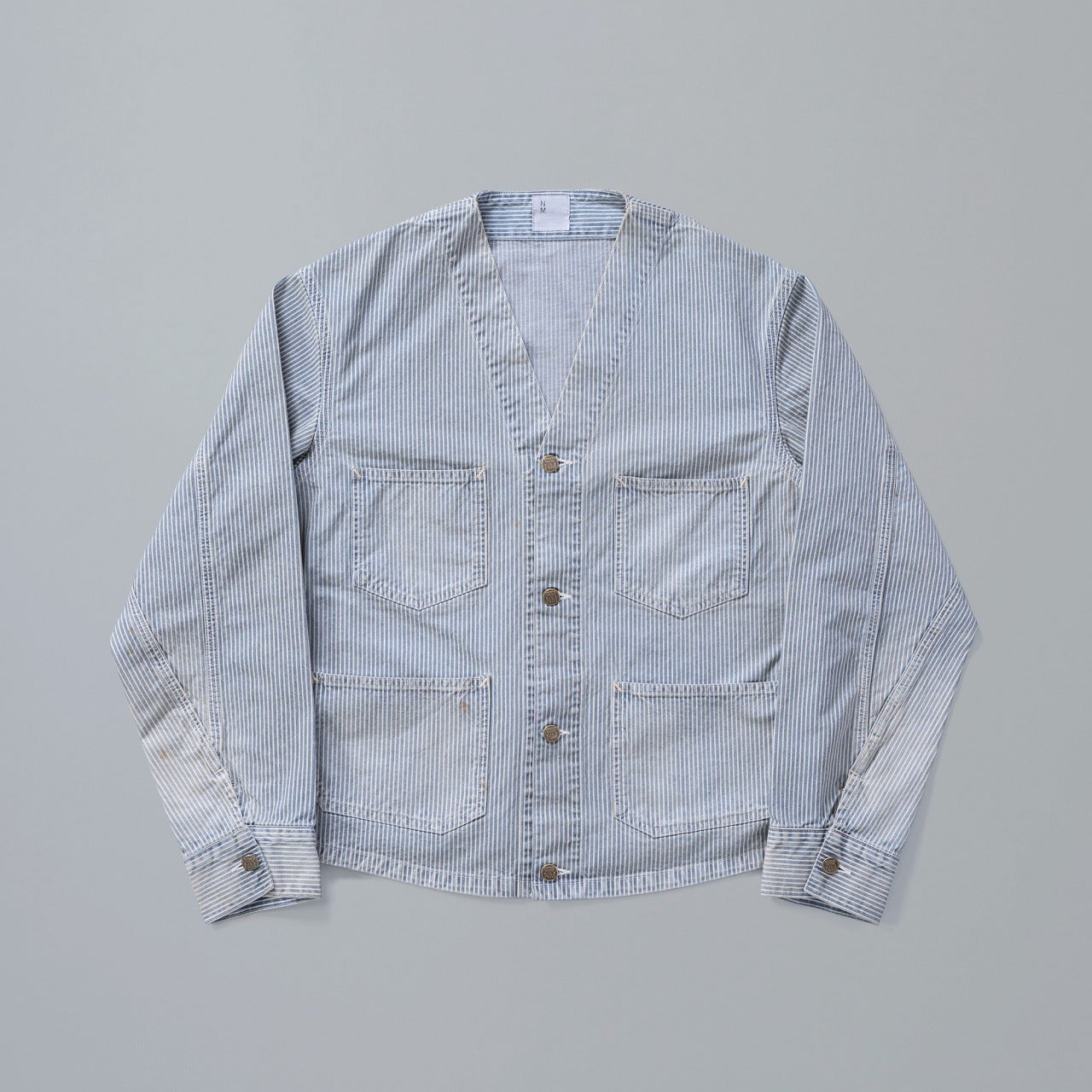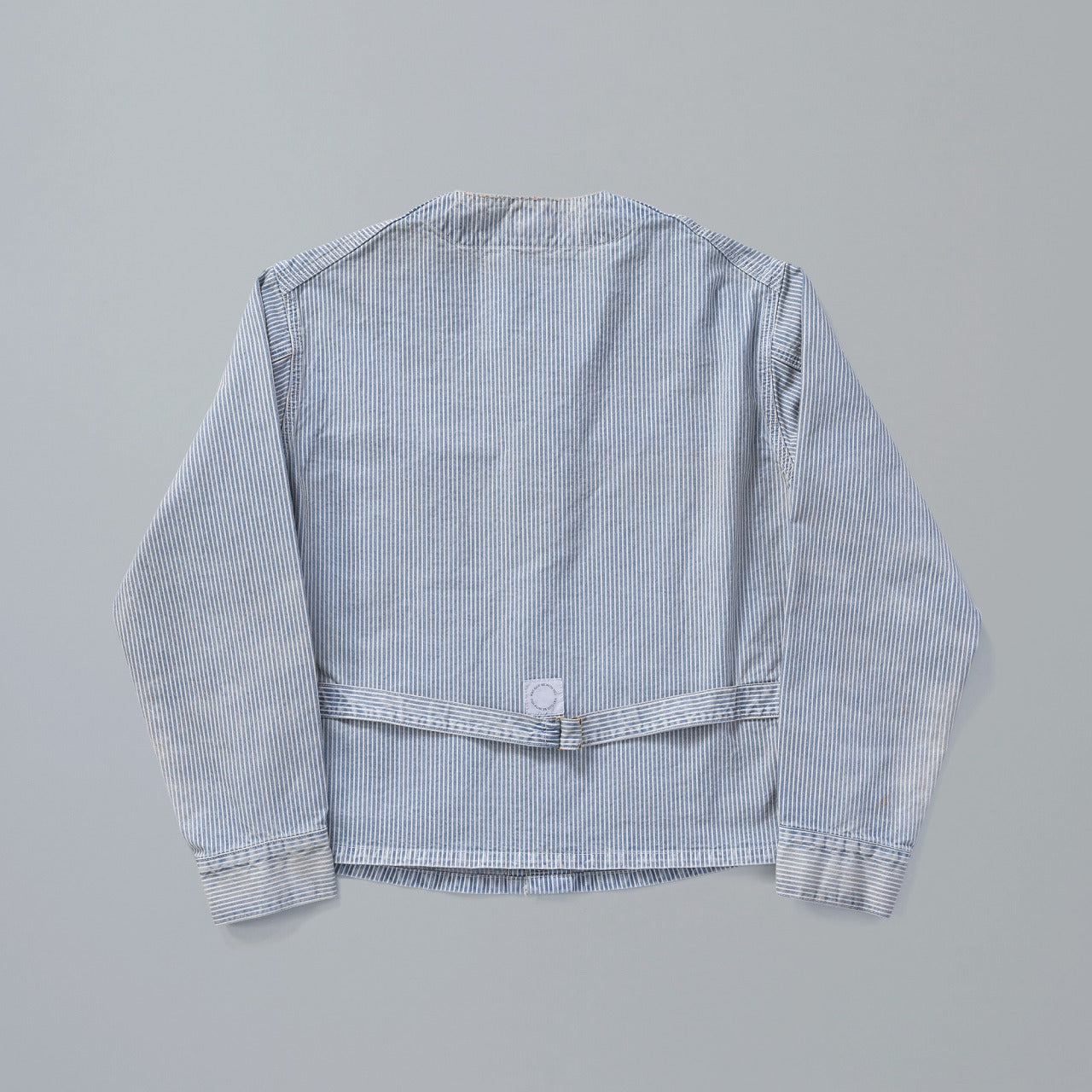 Based on a 1930s engineer jacket from a workwear brand, this piece is even rarer than #024 and #025. It features angular pockets and an oversized fit. To address the short length typical of engineer jackets, the body length, sleeve caps, and armholes have been adjusted for a better modern fit. Cinch back and label details are faithfully reproduced from the original piece. Subtle fading, faint whiskers, and light distressing have been recreated through expert-level processing rarely executed by even skilled artisans.