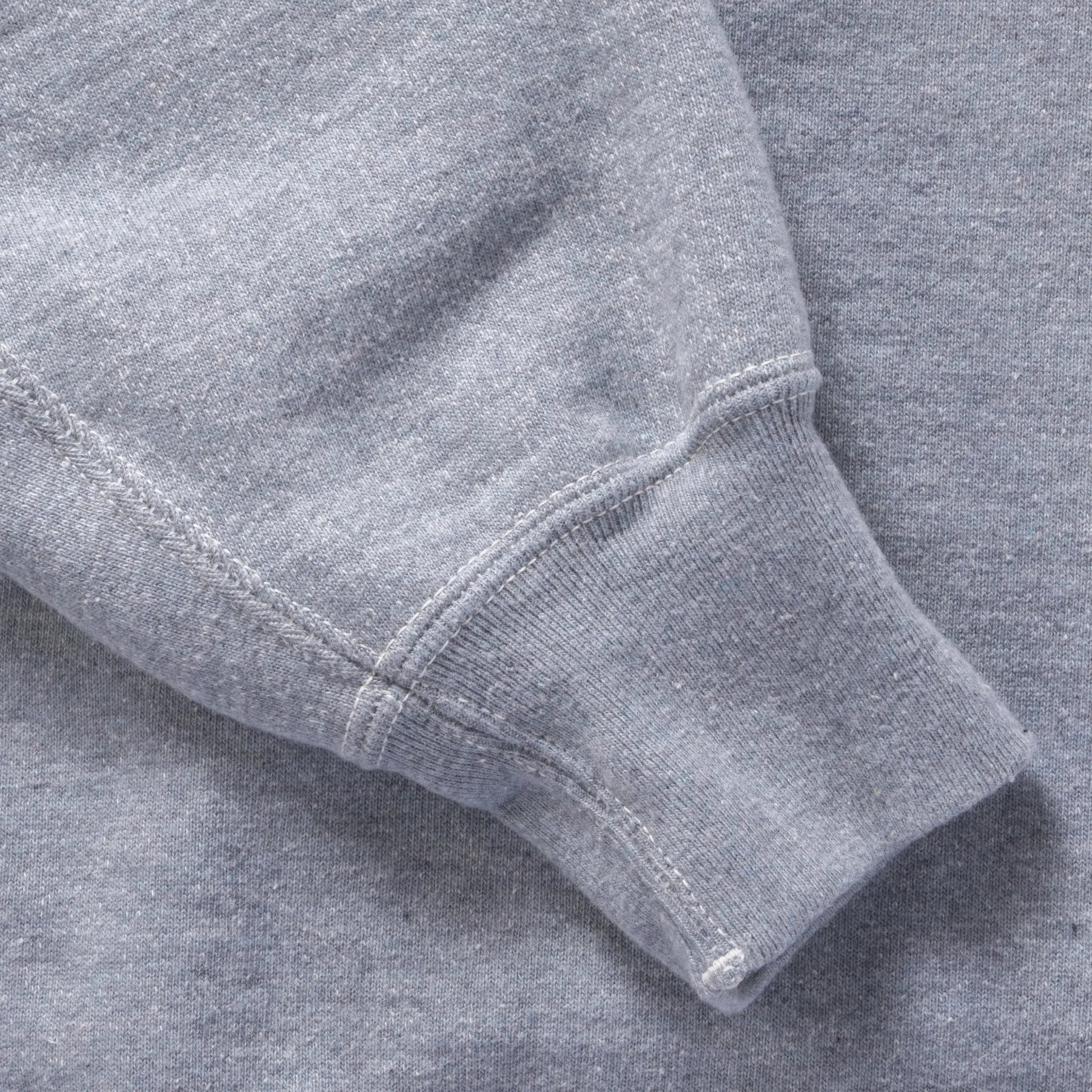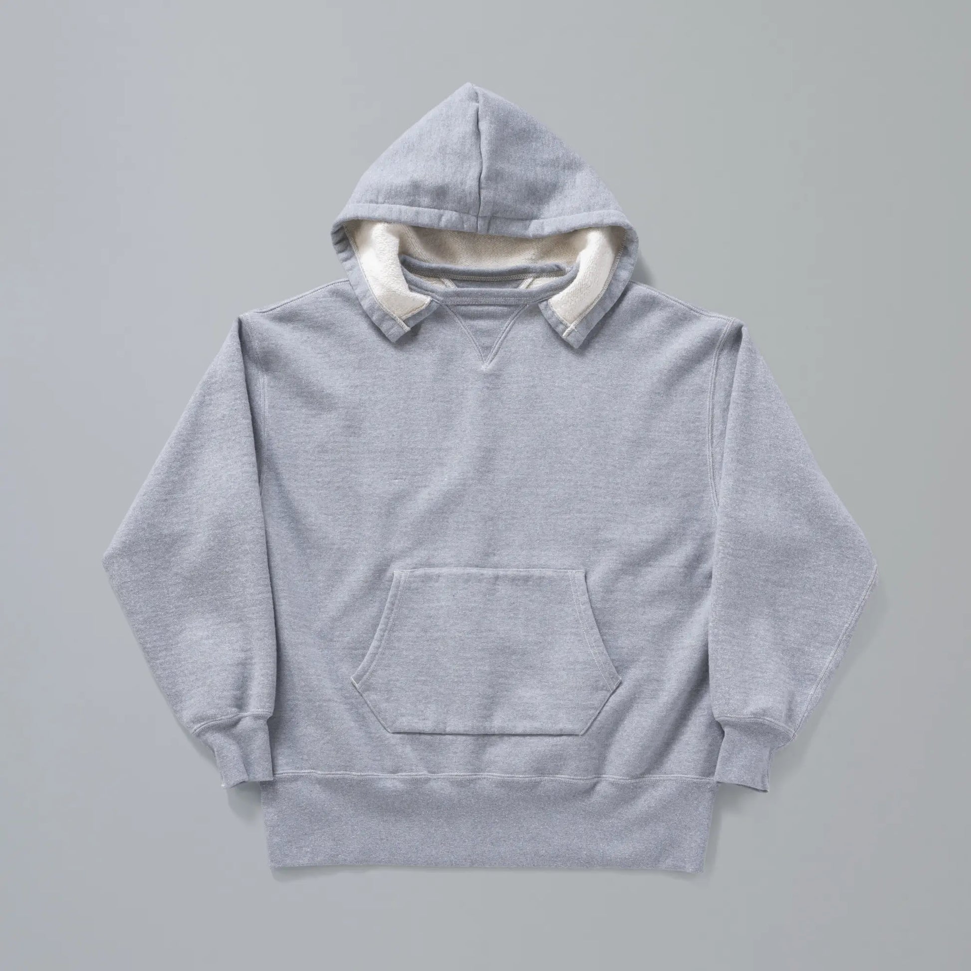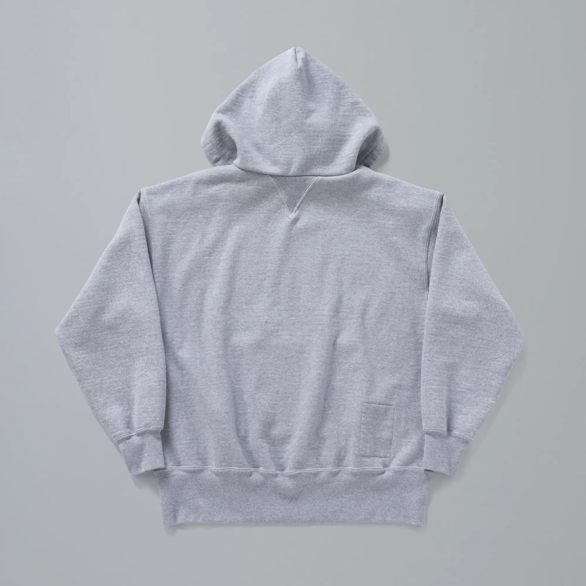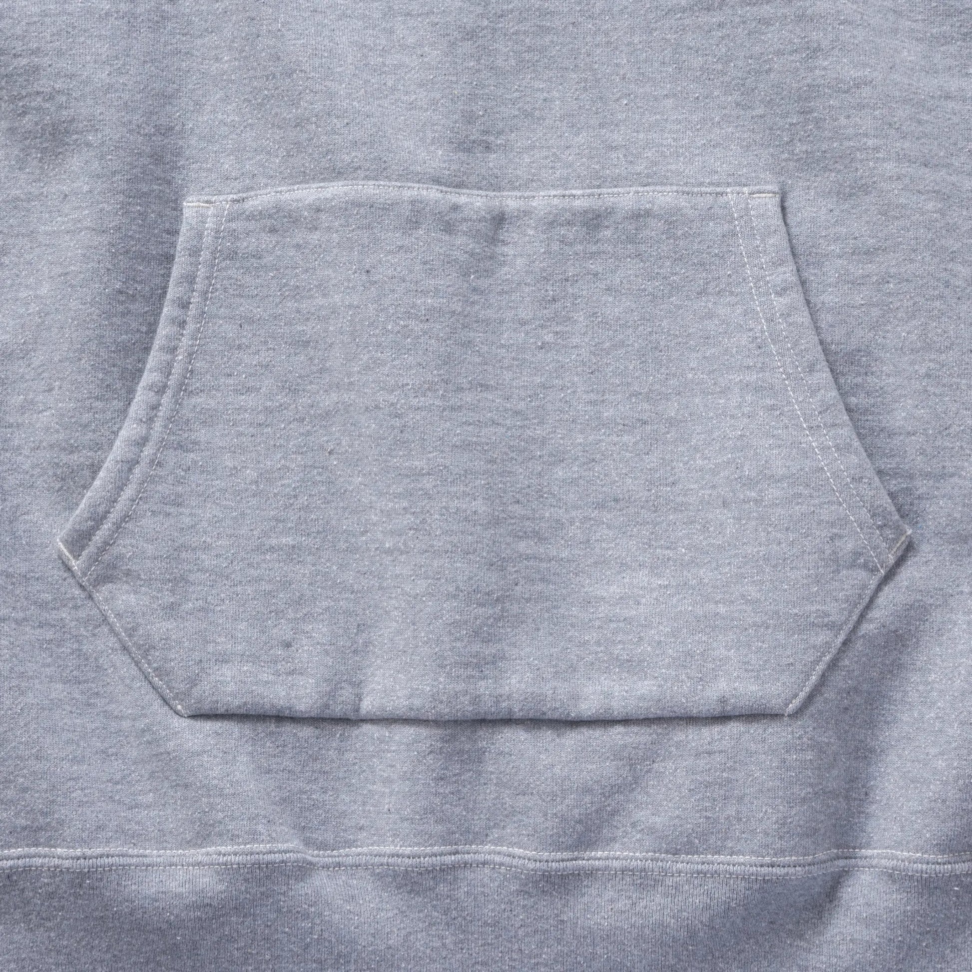 Based on a single-layer hoodie from the 1940s with a beautiful heather green tone, this piece pays special attention to replicating the exact color, texture, and feel of the original. The fabric is completely original, created from the cotton stage. The piece retains the original double V-gussets and add-on hood while reproducing wear around the sleeves and collar. The body length has been slightly extended to account for the vertical shrinkage common in vintage garments.