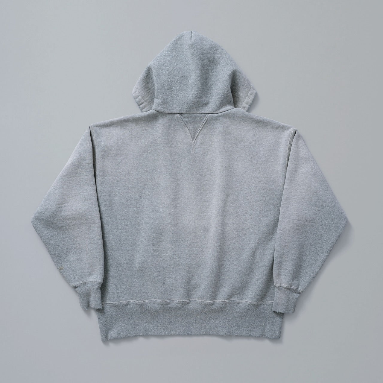 Based on a single-layer hoodie from the 1940s with a beautiful heather green tone, this piece pays special attention to replicating the exact color, texture, and feel of the original. The fabric is completely original, created from the cotton stage. The rare green tone and the sun-faded, aged look seen on the original have been authentically recreated using advanced techniques that are not typically employed. The piece retains the original double V-gussets and add-on hood while reproducing wear around the sleeves and collar. The body length has been slightly extended to account for the vertical shrinkage common in vintage garments.
