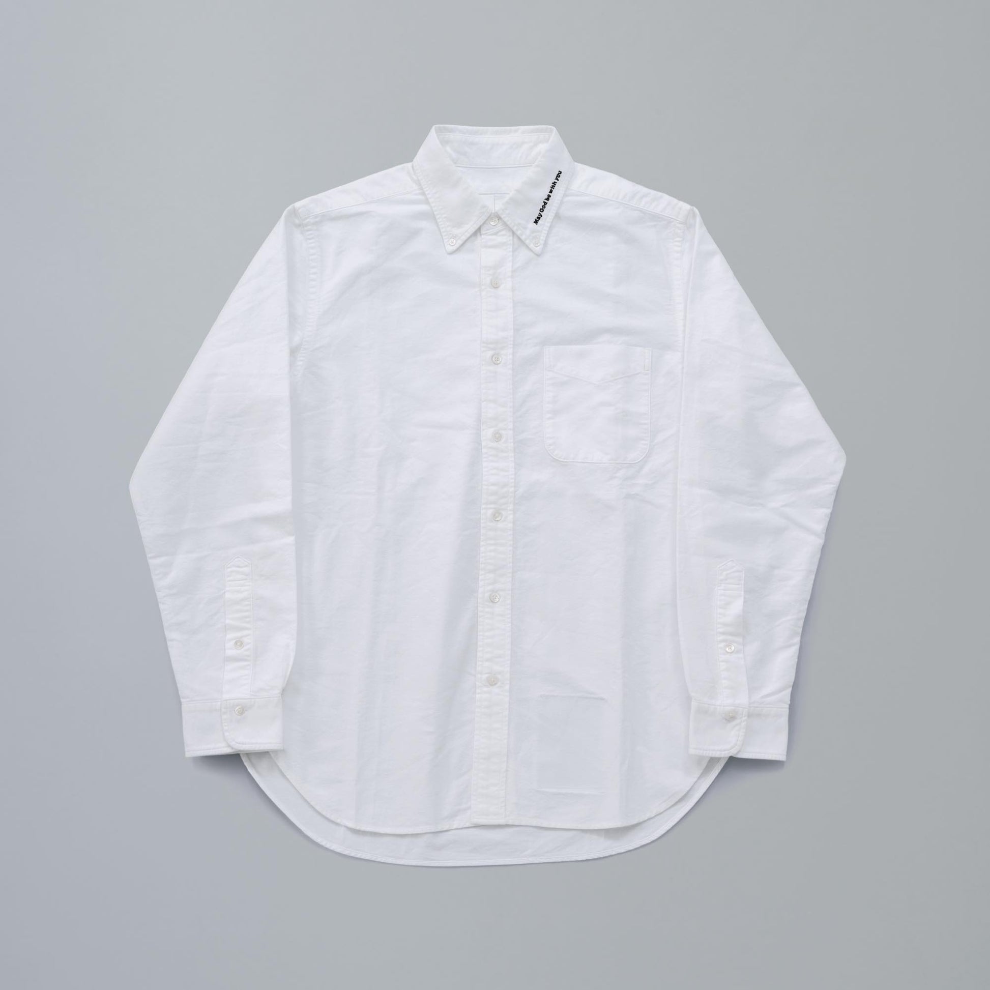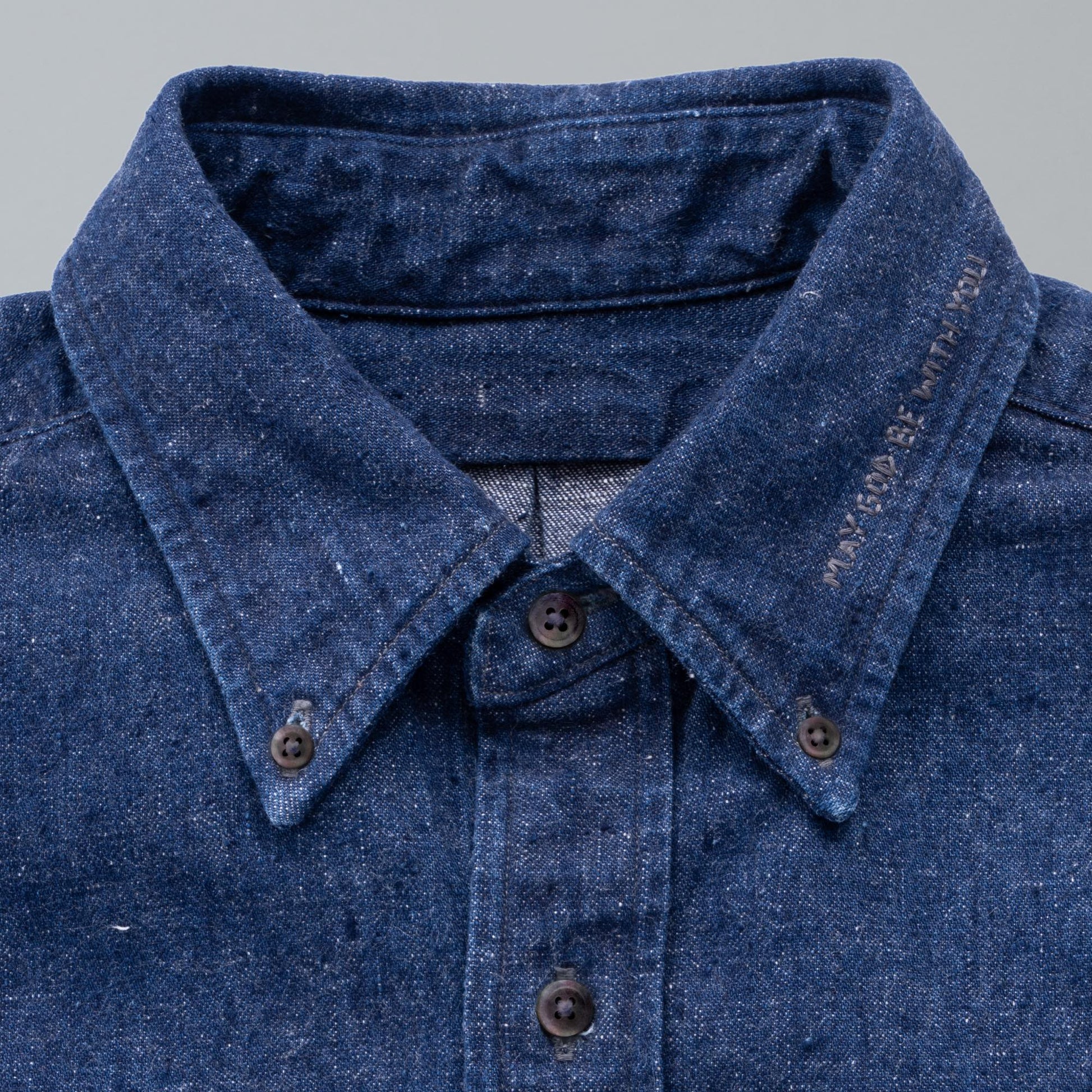 Based on a button‑down shirt from the 1990s, this piece retains its elegant silhouette with slight adjustments for a more relaxed fit. It incorporates 1950s‑inspired details like the collar shape, hem line, gussets, cuffs, yoke, and pocket design while carrying over the original embroidery on the collar. The metal buttons are engraved with the phrase “MAY GOD BE WITH YOU.”