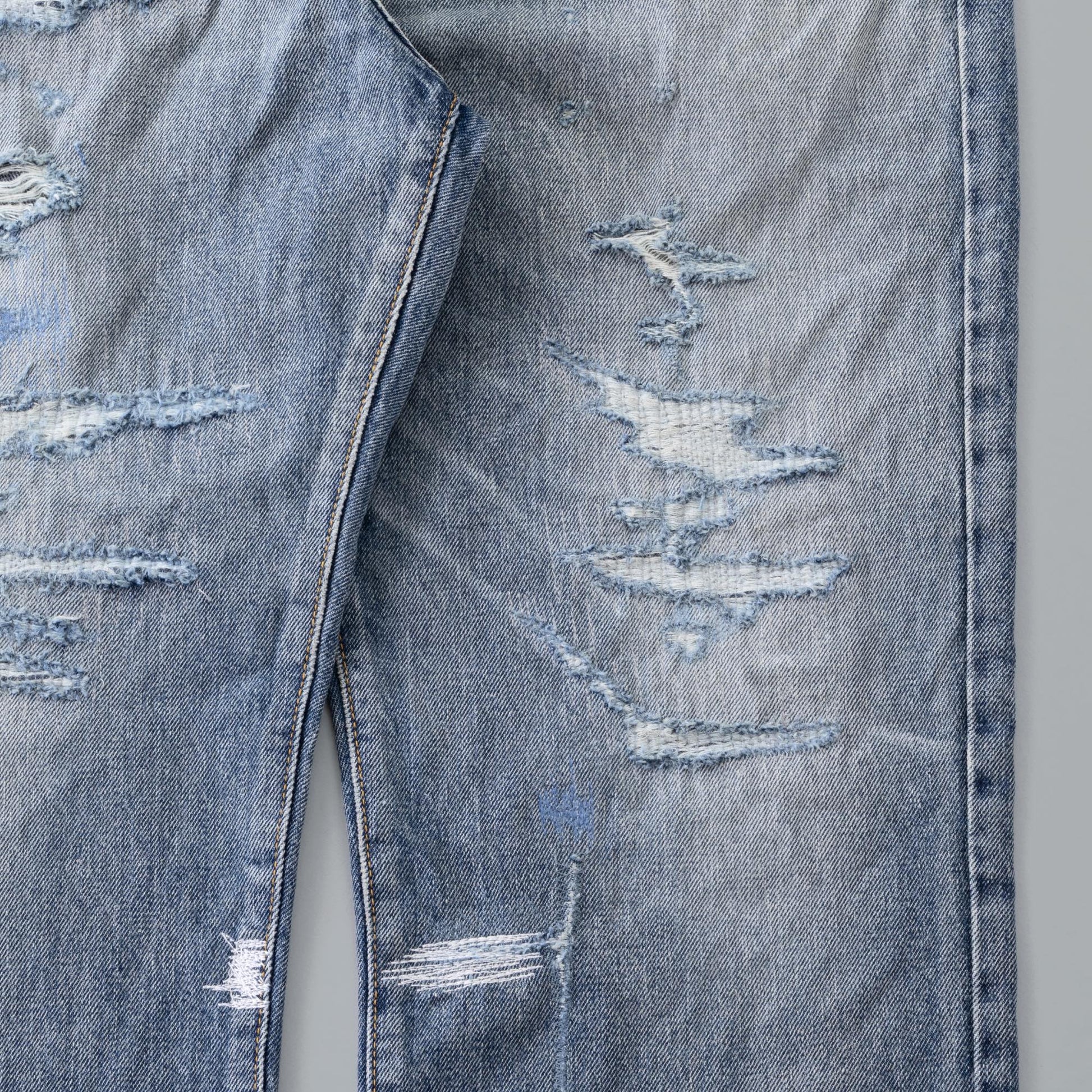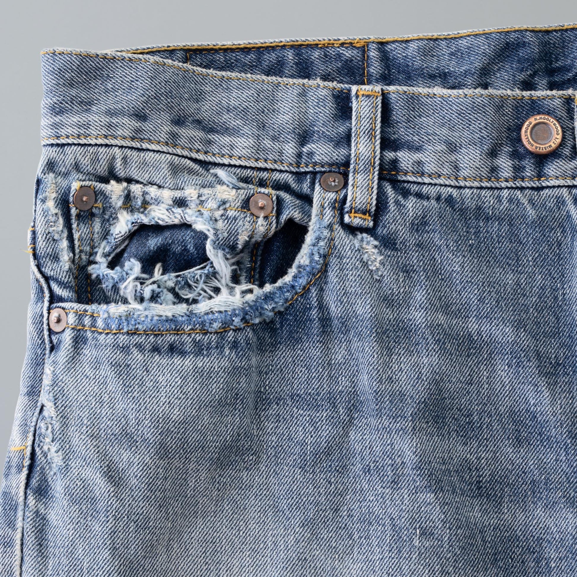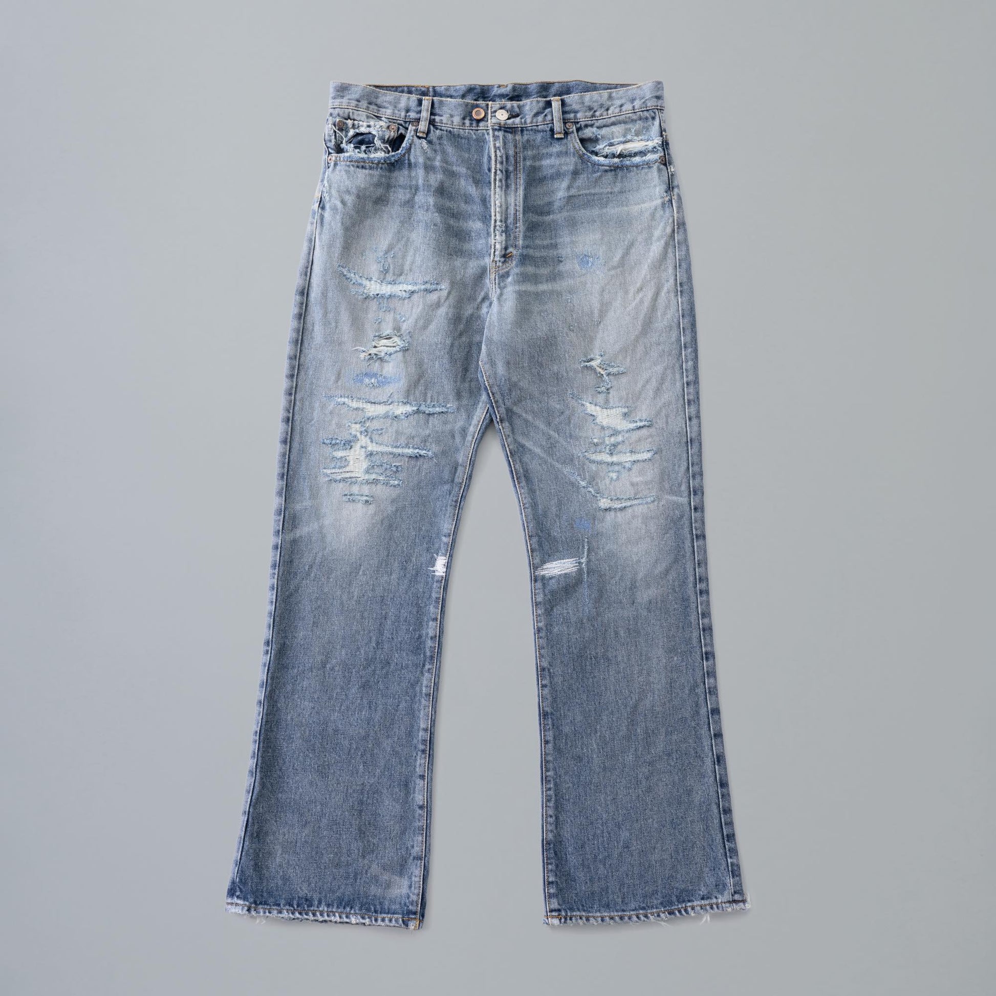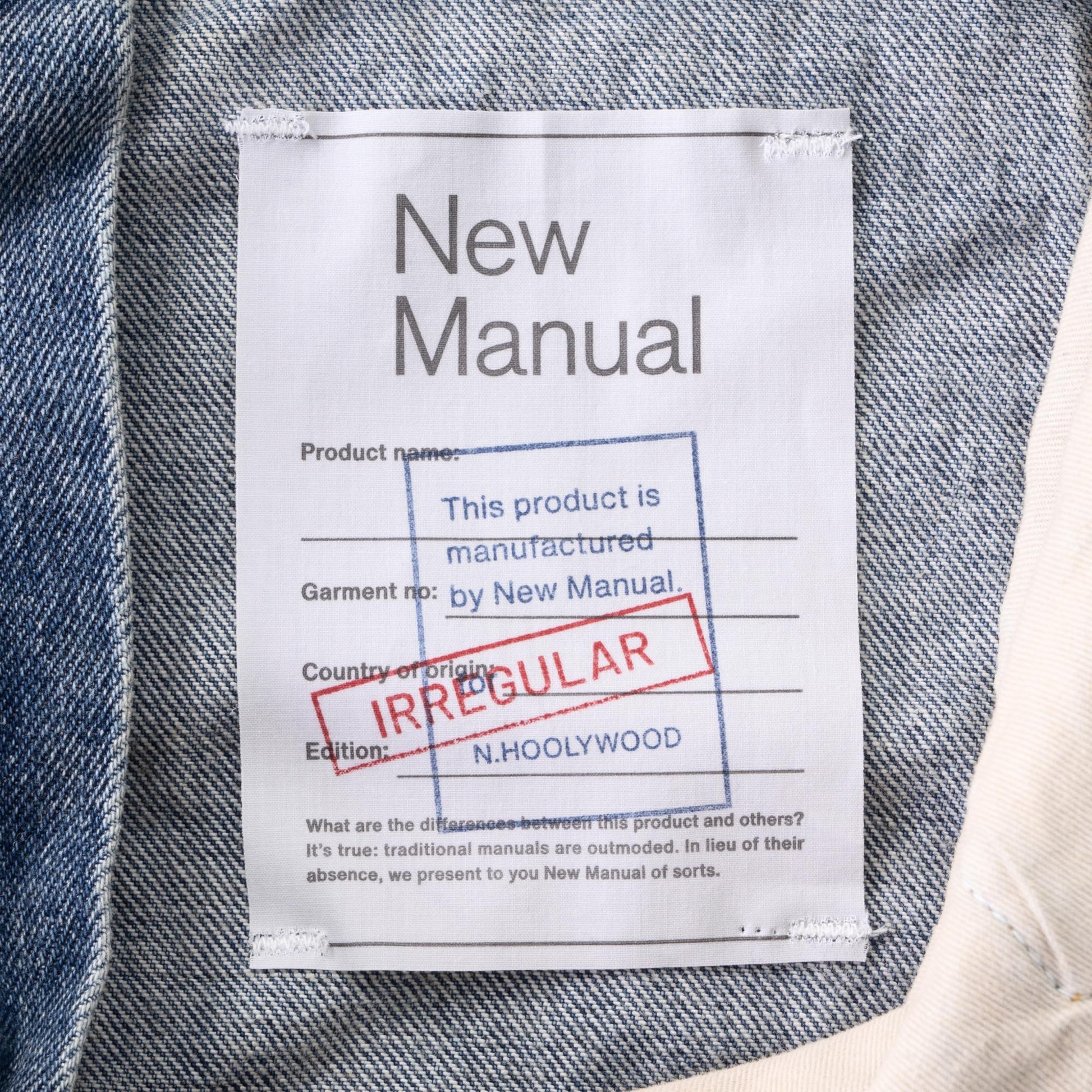 New Manual has now realized a collaboration with N.HOOLYWOOD designer Daisuke Obana. These flared denim pants have been created based on vintage denim owned by Mr. Obana himself. To really recreate that vintage look, the material is 11.8 oz denim, a slightly thinner type that is a departure from the denim that New Manual normally uses. Just like the N.HOOLYWOOD COMPILE standard denim articles, two buttons at the waist allow for adjustment of size, while everything from the worn look to the peeling patches and stitching on the cut-into pockets have been recreated. New Manual has now taken this product and reworked every single point from our own unique perspective. Aiming for a condition evocative of a longtime wearer having repaired the garment themselves, the knees in particular look like roughshod 1970s home repairs have been performed on excessive crush damage in the area. We have forged nothing less than the physical epitome of the desire to continue to keep wearing one special piece of clothing—and that has now become a New Manual IRREGULAR.