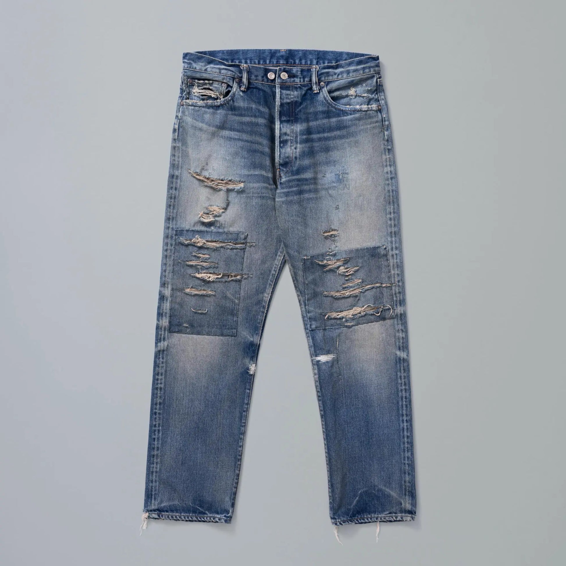 The second collaboration with N.HOOLYWOOD designer Obana Daisuke. The rise is slightly deep, with a straight silhouette that tapers slightly from the thigh to the hem. Based on vintage denim owned by Obana, the jeans are faithfully reproduced down to the smallest details, such as the size, stitching, and even the slight damage and dirt on the fabric. Patches that were remade by a previous owner are used on both knees. The details are based on N.HOOLYWOOD's classic items, and the size can be adjusted at the waist using two original buttons from N.HOOLYWOOD and New Manual, and the back of the hip comes with a collaboration-only name tag that features the N.HOOLYWOOD logo printed on the New Manual original name tag. New Manual has reworked each piece of this product from a unique perspective. The aim was to recreate the "changed condition of the item as it ages with the owner continuing to wear it." This is what we call the New Manual IRREGULAR.